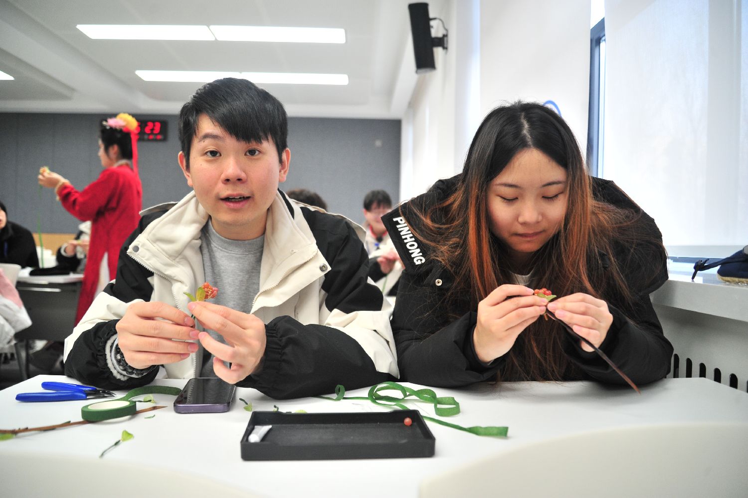 1月23日,吉林长春,台湾青年在制作汉服手工仿绒花雪花胸针。当天,以“携手正青春 同心向未来”为主题的2024年全国台联第三十届台胞青年冬令营在吉林大学开营。(图片来源:中新社)