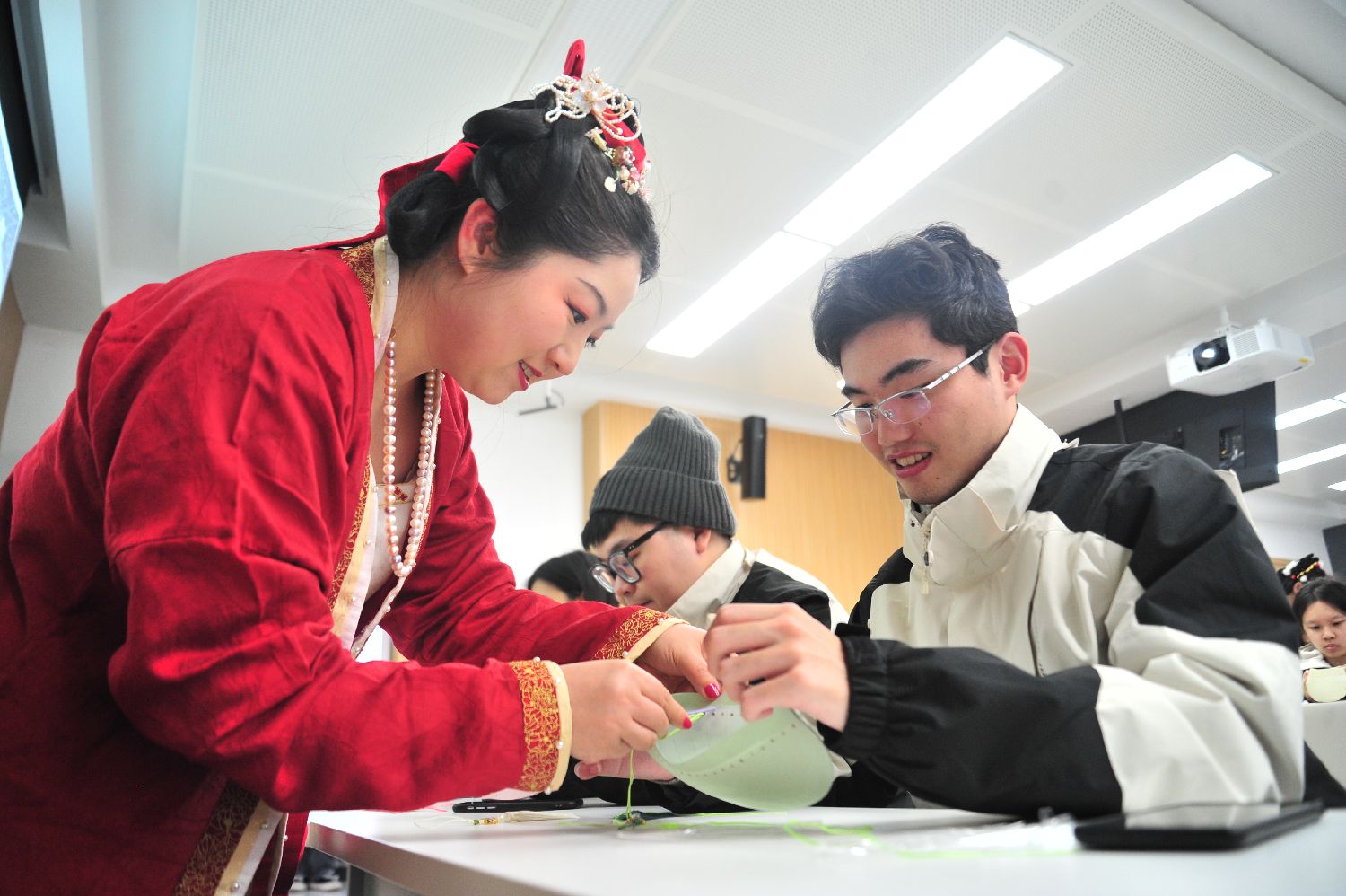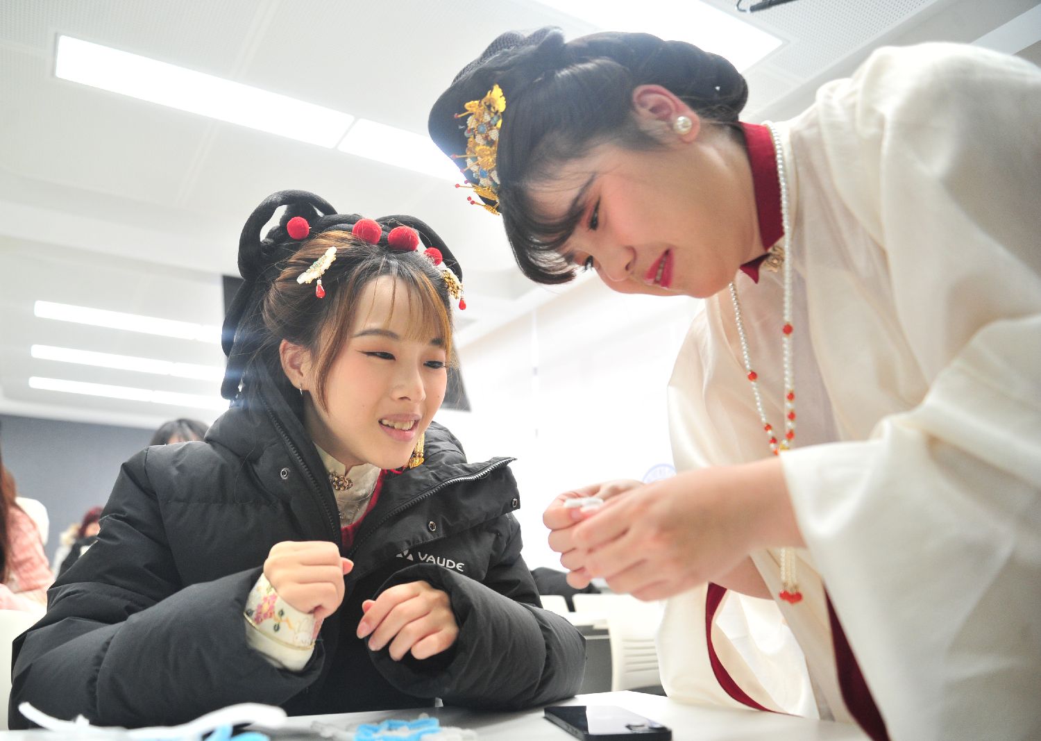 1月23日,吉林长春,台湾青年(右)在学习制作汉服古法腰圆荷包。(图片来源:中新社)