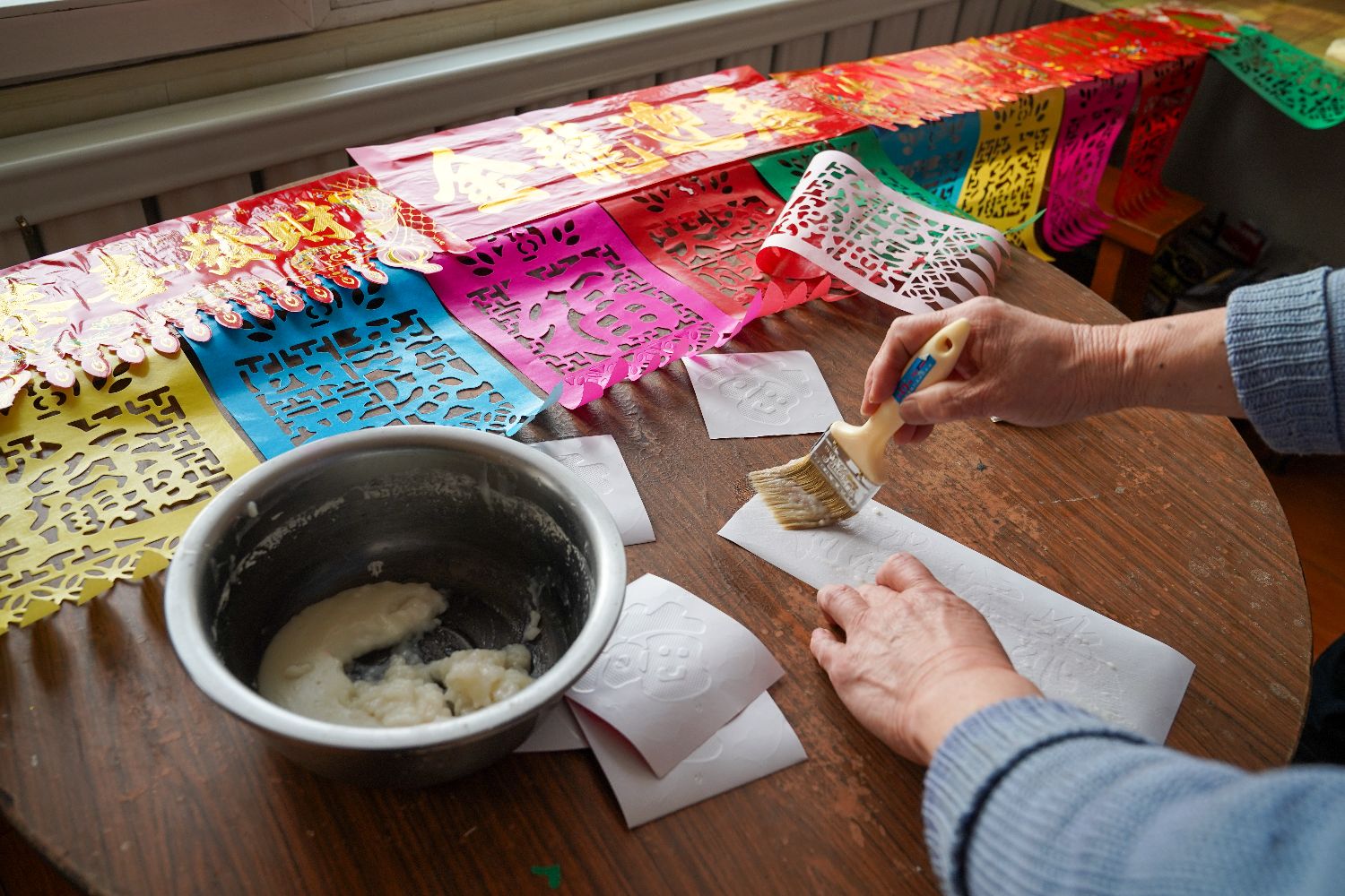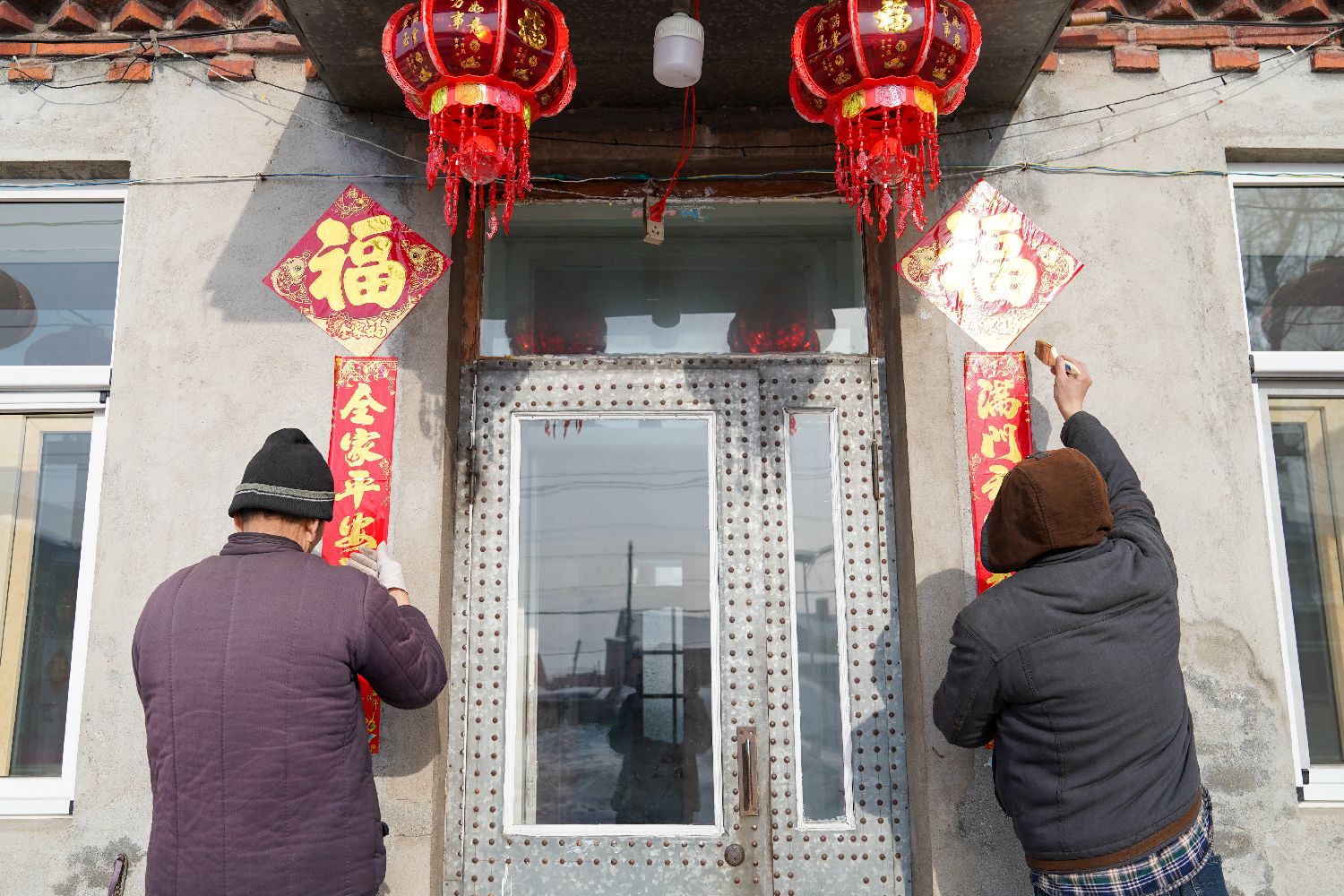 2月6日,农历二十七,黑龙江哈尔滨,刘玉书的家人将浆糊涂抹到春联上。(图片来源:中新社)