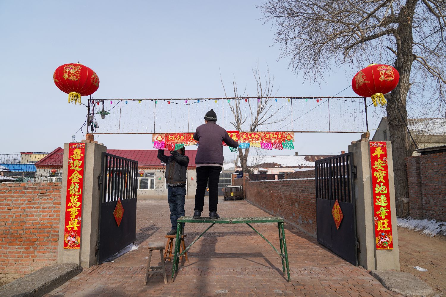 2月6日,农历二十七,黑龙江哈尔滨,刘玉书(右)与其家人共同挂春联。(图片来源:中新社)