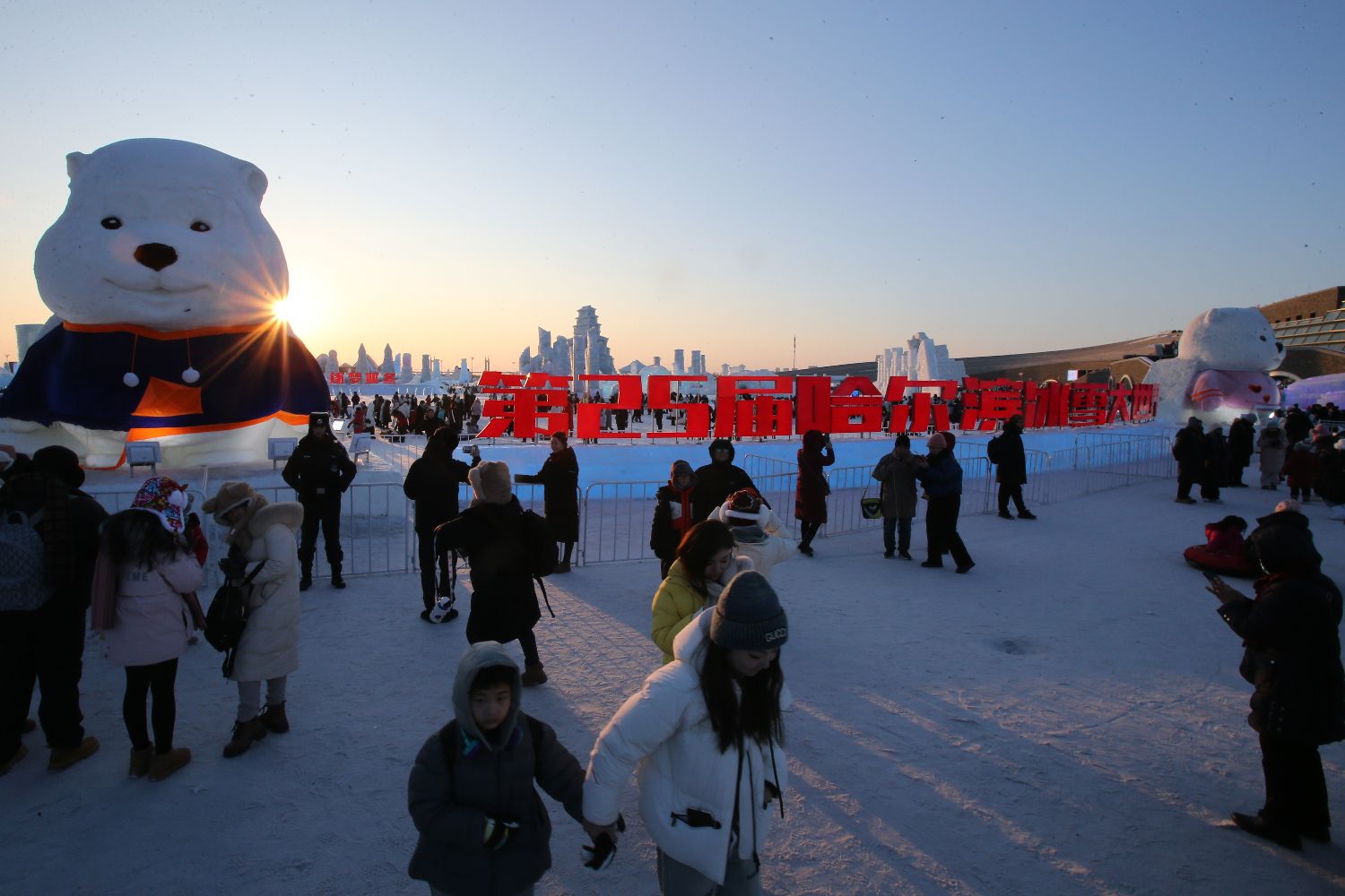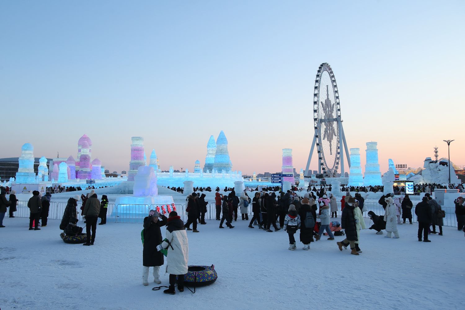 2月15日,民众游览哈尔滨冰雪大世界景区。近日,黑龙江哈尔滨气温逐渐回升,为保障游客的安全和良好的游玩体验,哈尔滨冰雪大世界景区于2024年2月15日24时起闭园。(图片来源:中新社)