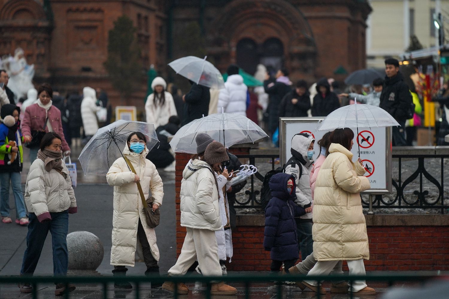 2月18日,市民雨雪天气中打伞出行。当日,黑龙江省哈尔滨市发布寒潮蓝色预警,气温大幅度下降。(图片来源:中新社)