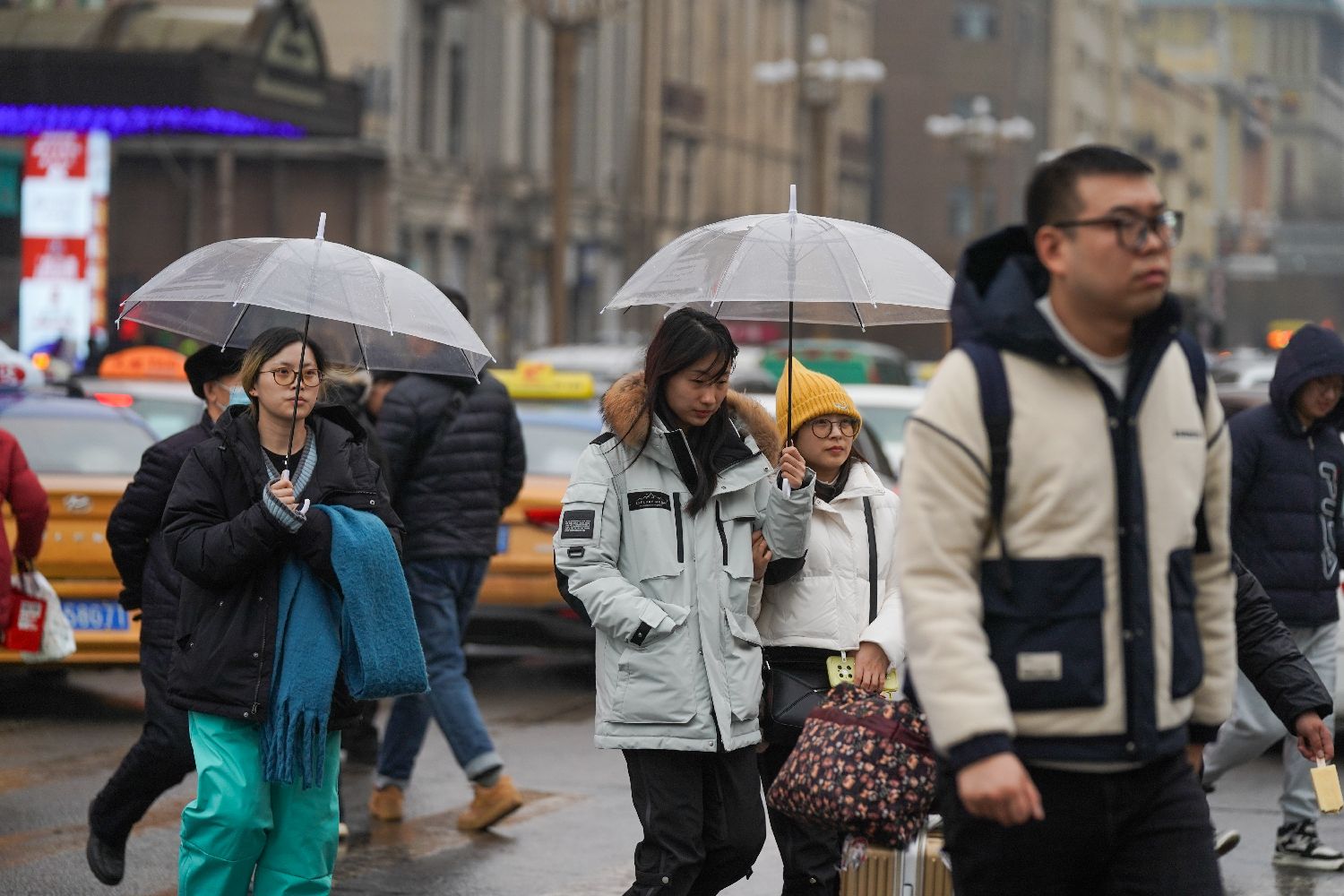 2月18日,市民雨雪天气中出行。当日,黑龙江省哈尔滨市发布寒潮蓝色预警,气温大幅度下降。(图片来源:中新社)