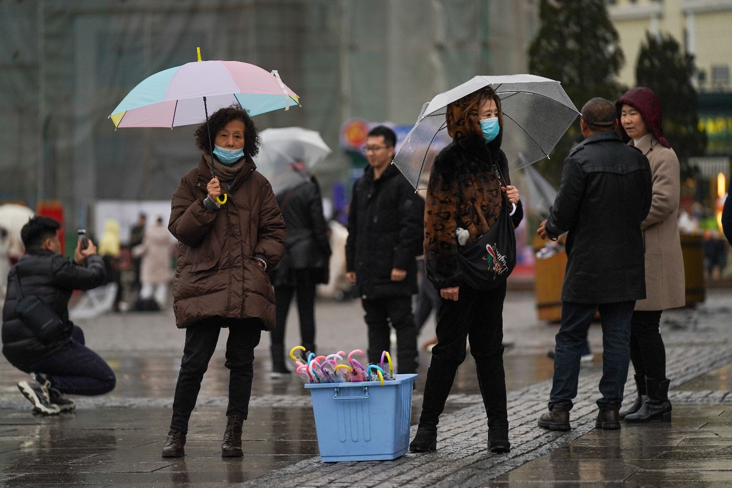 2月18日,商贩售卖雨伞。(图片来源:中新社)