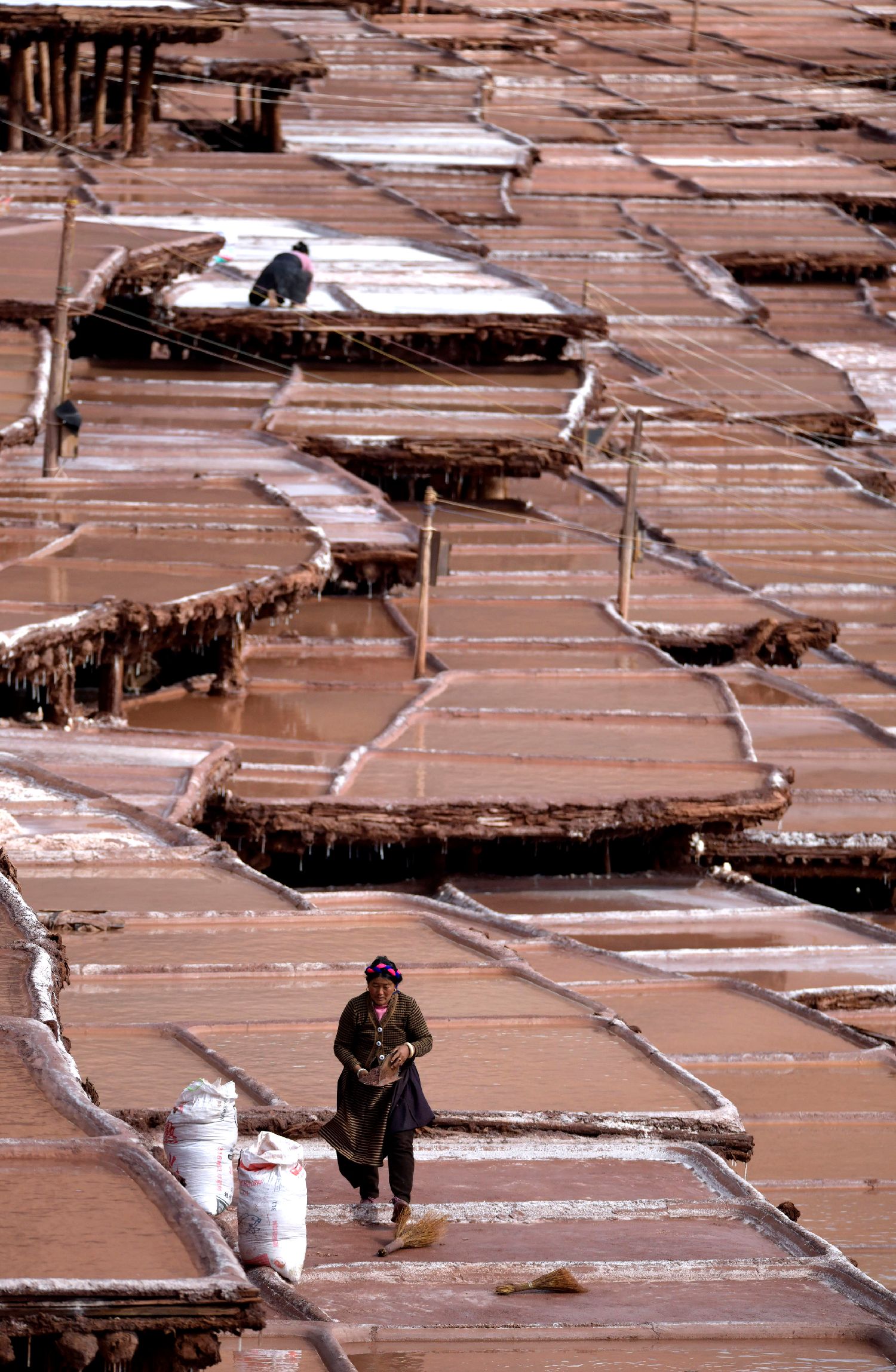 2月20日,民众在西藏昌都芒康千年古盐田里劳作。(图片来源:中新社)