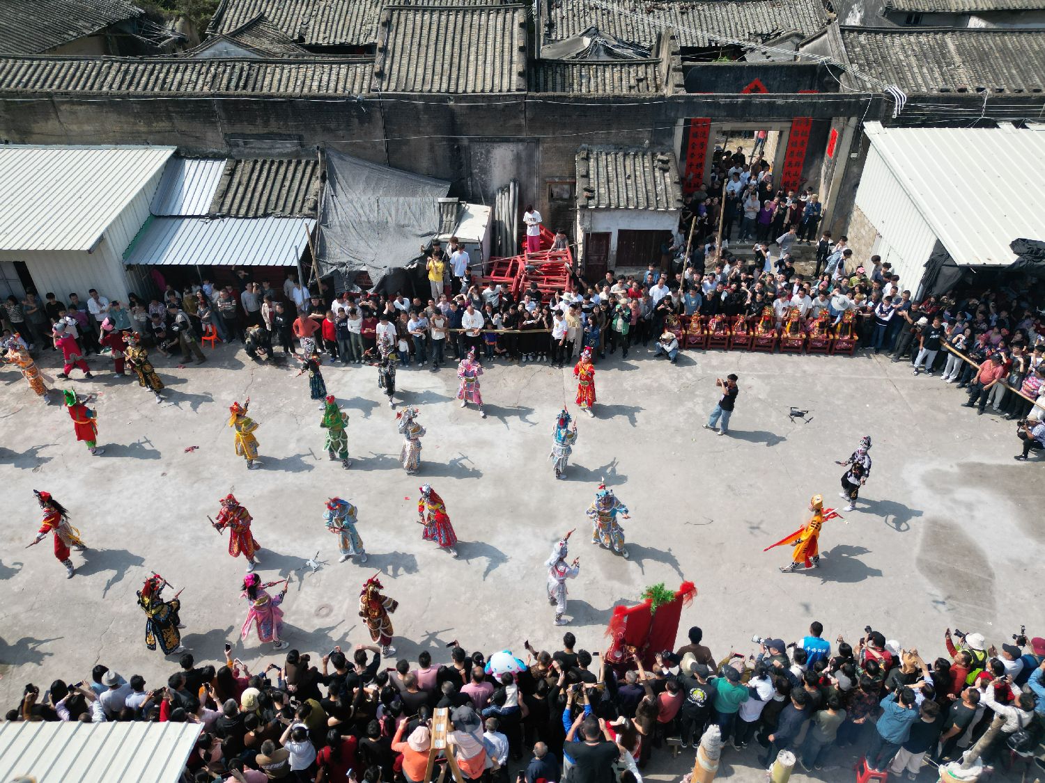 2月20日,广东潮州溪美寨村举行传统游神民俗活动,其中巡游队伍的英歌舞表演吸引民众观看。(无人机照片)(图片来源:中新社)
