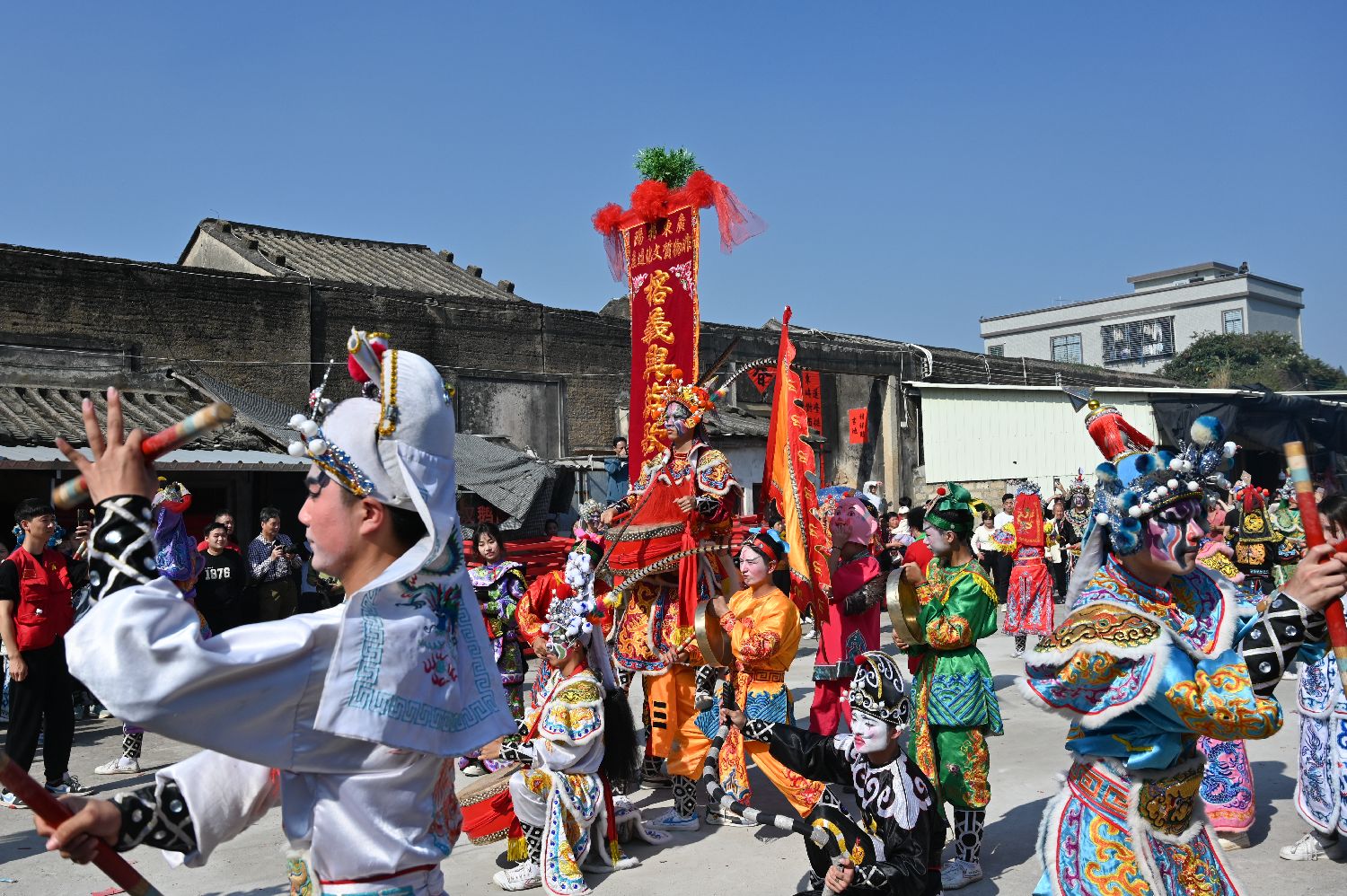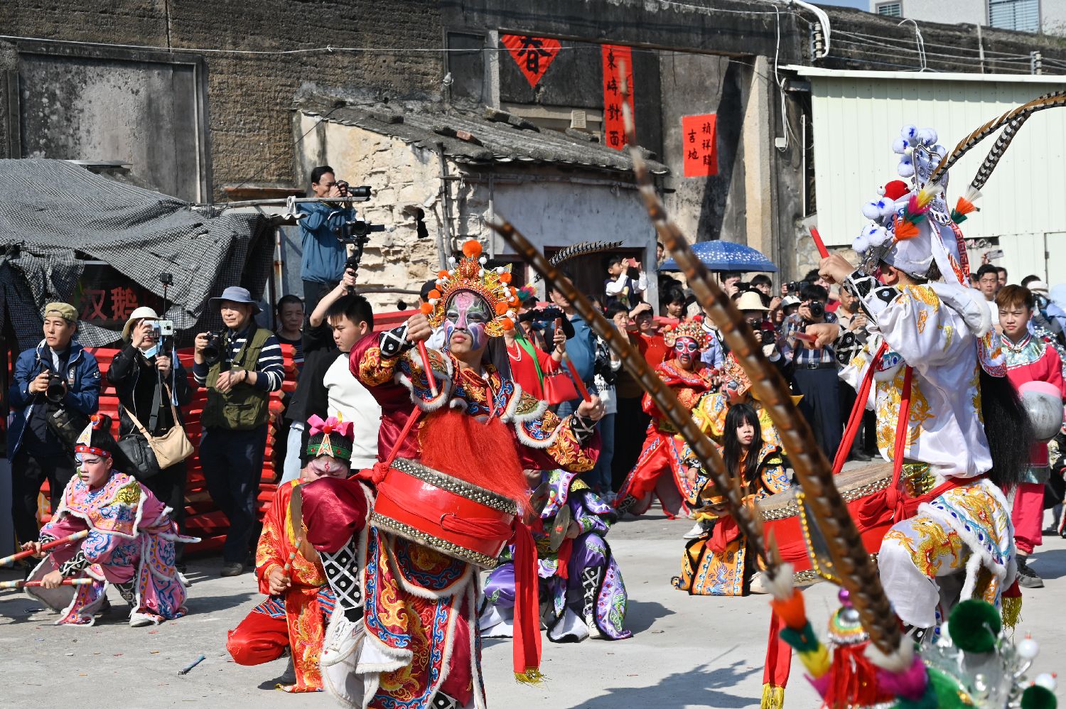2月20日,广东潮州溪美寨村举行传统游神民俗活动,其中巡游队伍的英歌舞表演吸引民众观看。(图片来源:中新社)