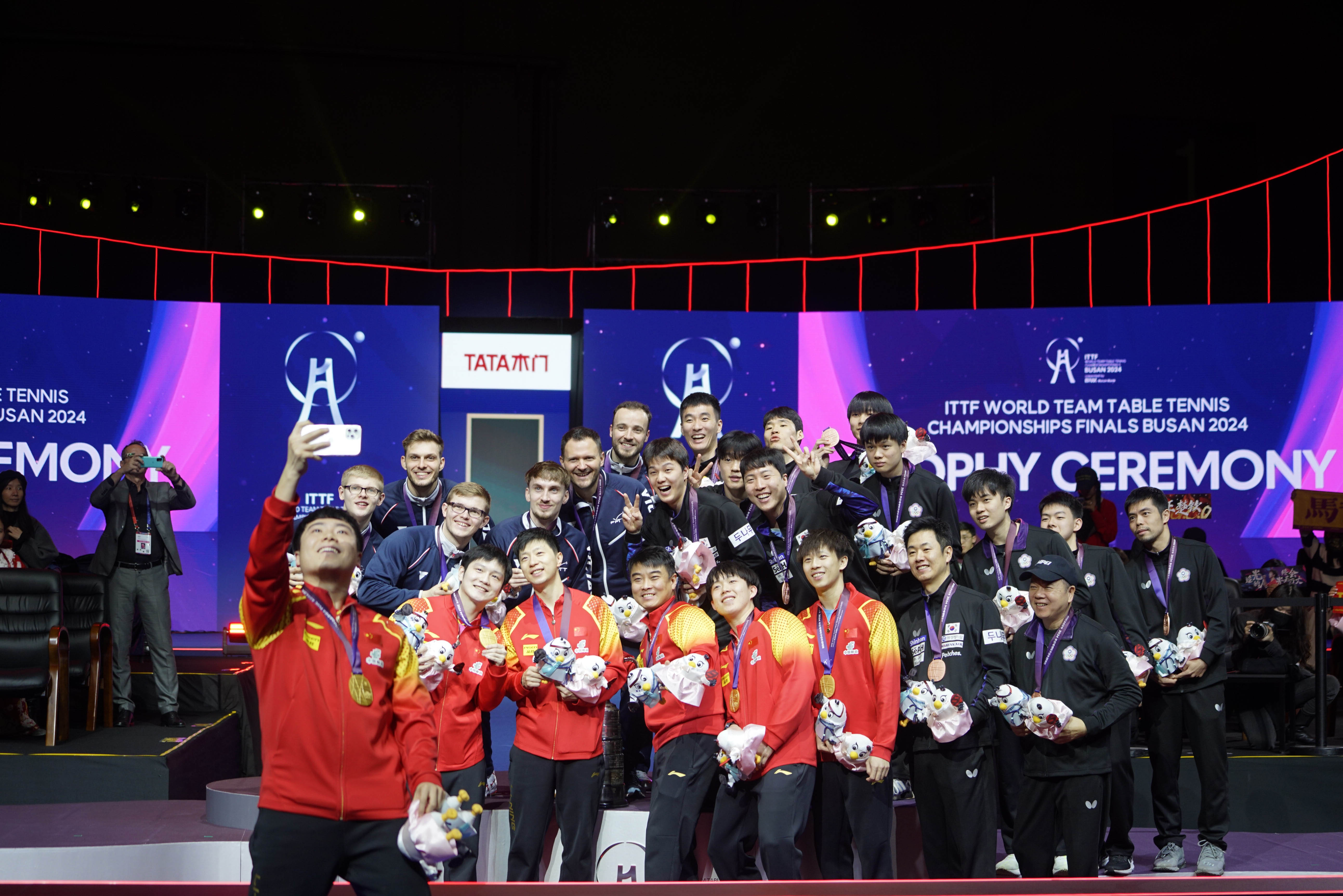 当地时间2月25日晚,中国队庆祝夺冠。当日,在韩国釜山进行的2024年国际乒联釜山世界乒乓球团体锦标赛男子团体决赛中,中国队3:0战胜法国队,实现世乒赛11连冠。(图片来源:中新社)