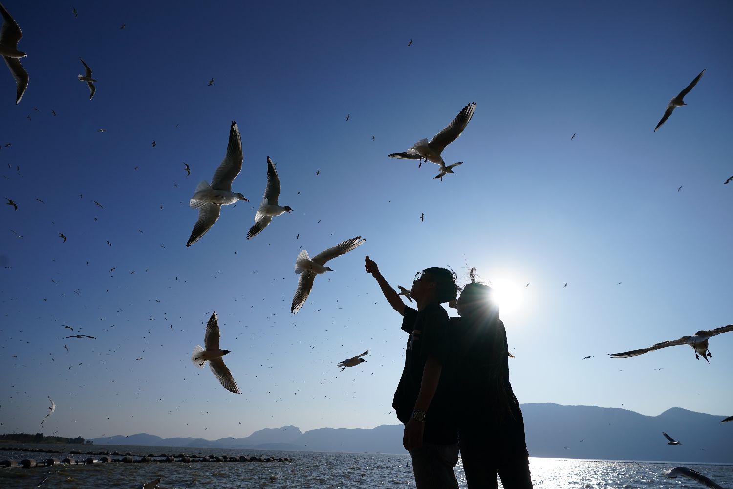 3月4日,云南昆明,一对情侣在滇池边喂红嘴鸥。随着天气回暖,越冬的红嘴鸥将陆续飞回栖息地,众多市民和游客来到滇池边与红嘴鸥互动。(图片来源:中新社)