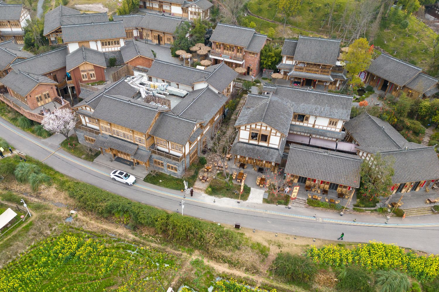 3月6日,四川成都官塘新村被盛开的油菜花掩映,春色如画。其经过聚落重建、古建复原的川西林盘风貌吸引了游客前来游览。(无人机照片)(图片来源:中新社)