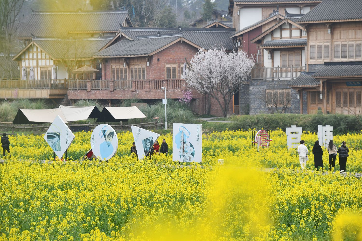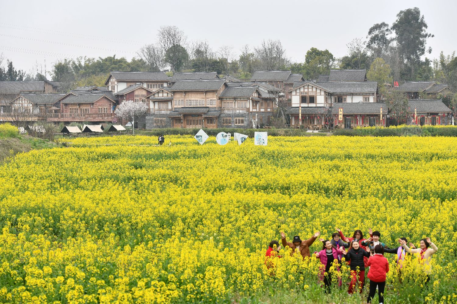 3月6日,四川成都官塘新村被盛开的油菜花掩映,春色如画。其经过聚落重建、古建复原的川西林盘风貌吸引了游客前来游览。(图片来源:中新社)