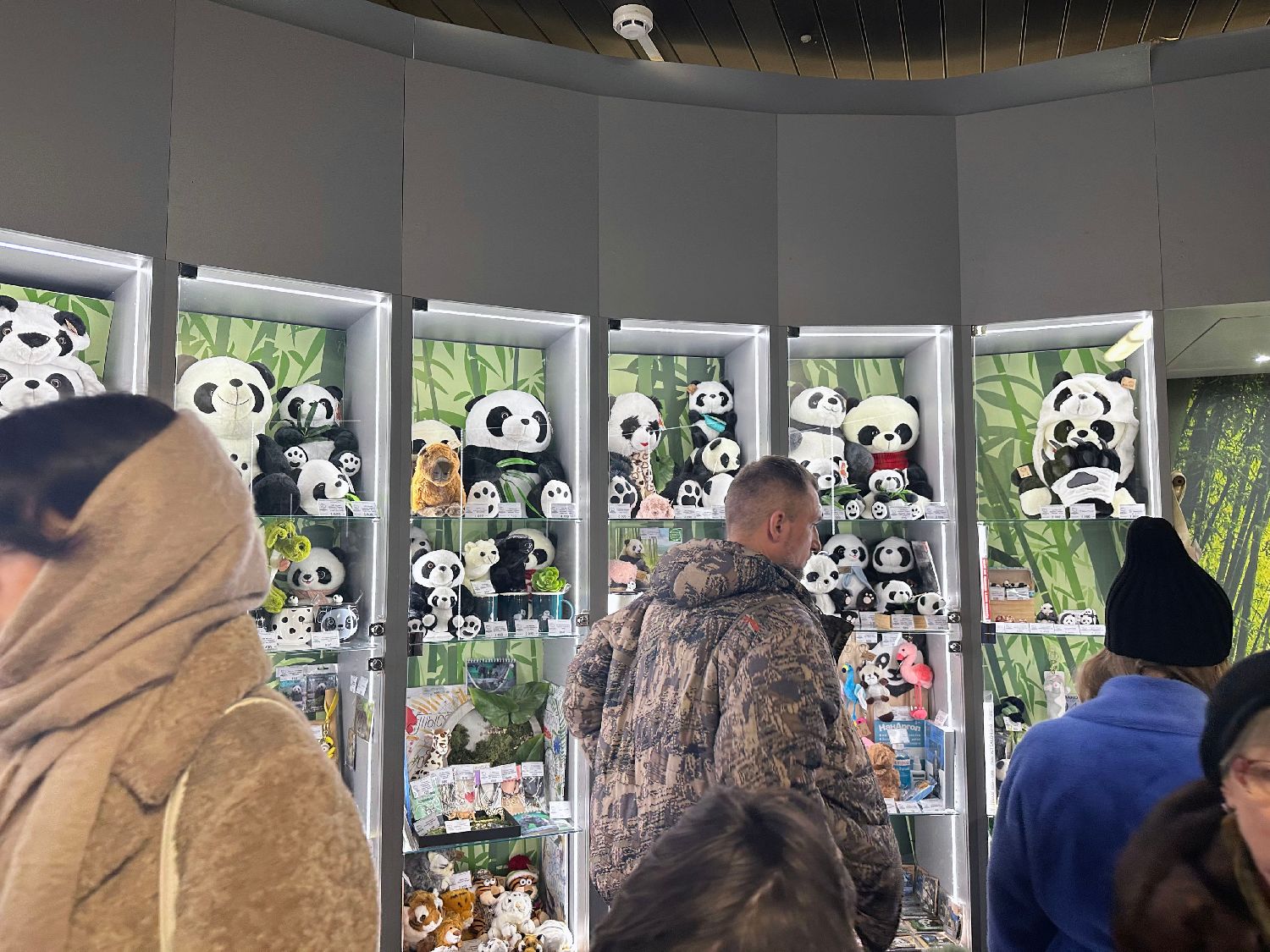 图为参观者走过大熊猫玩偶陈列柜。(图片来源:中新社)