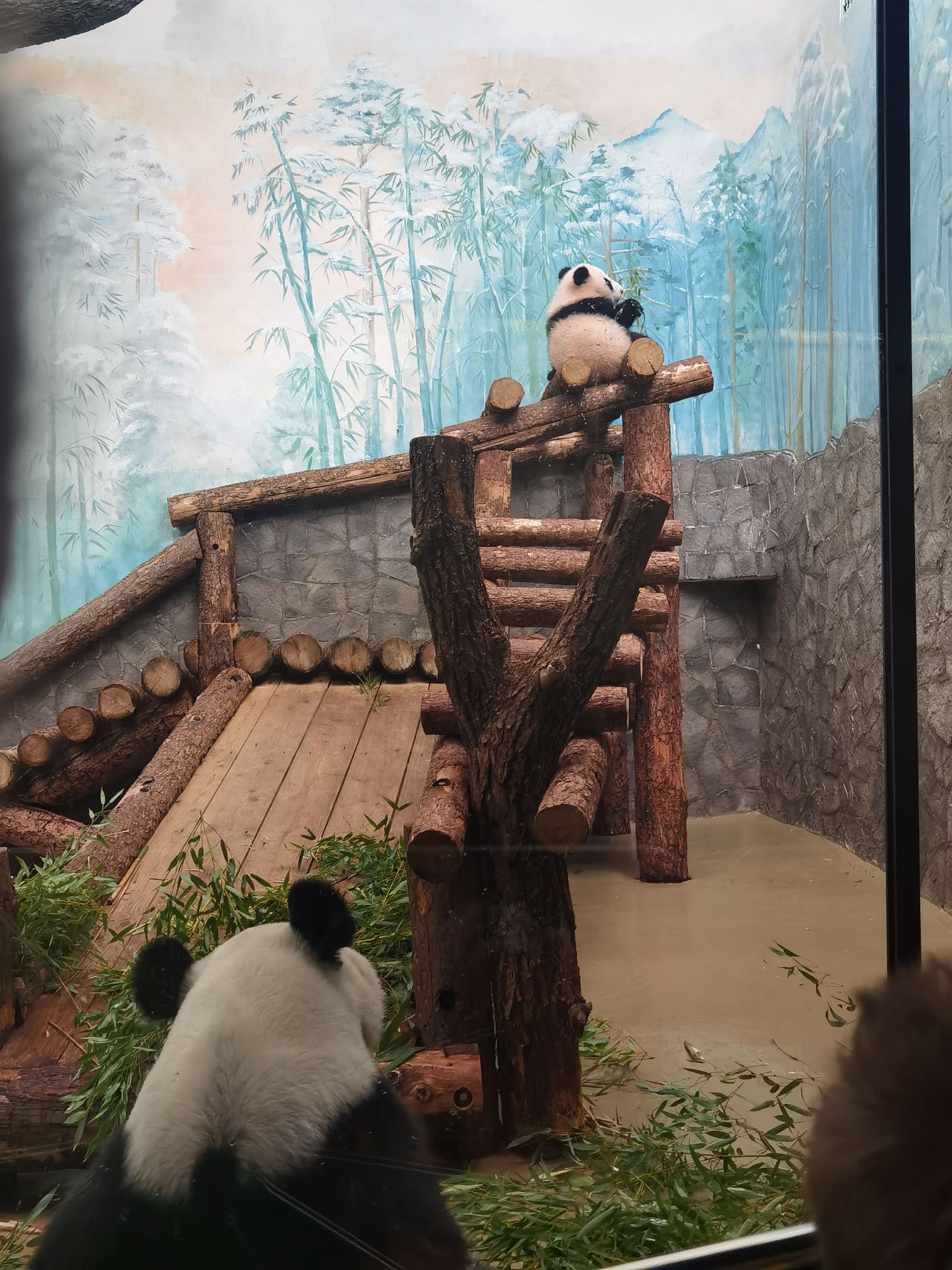 当地时间3月8日,俄罗斯首都莫斯科,首只在俄出生大熊猫“喀秋莎”在莫斯科动物园首次与公众见面。图为“喀秋莎”(后)与母亲“丁丁”(前)。(图片来源:中新社)
