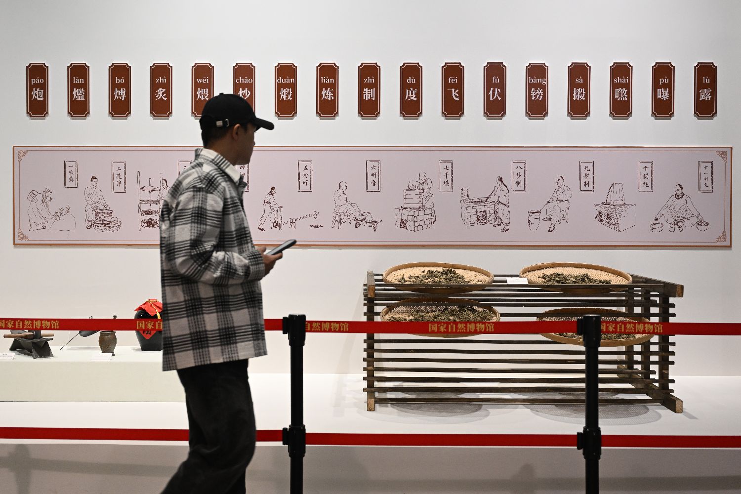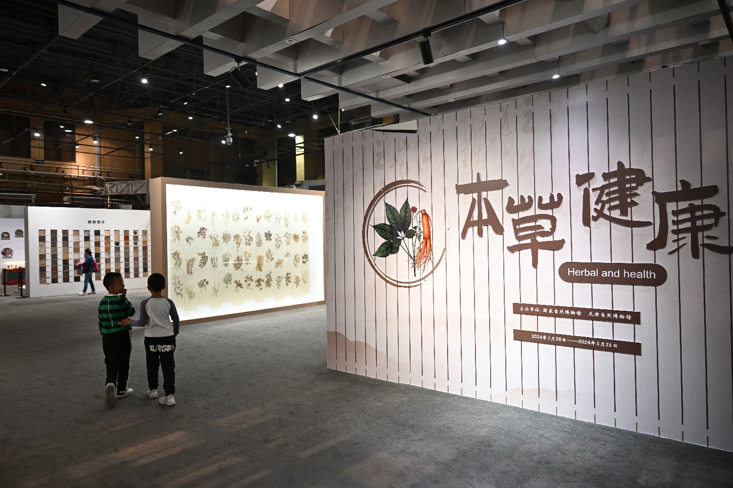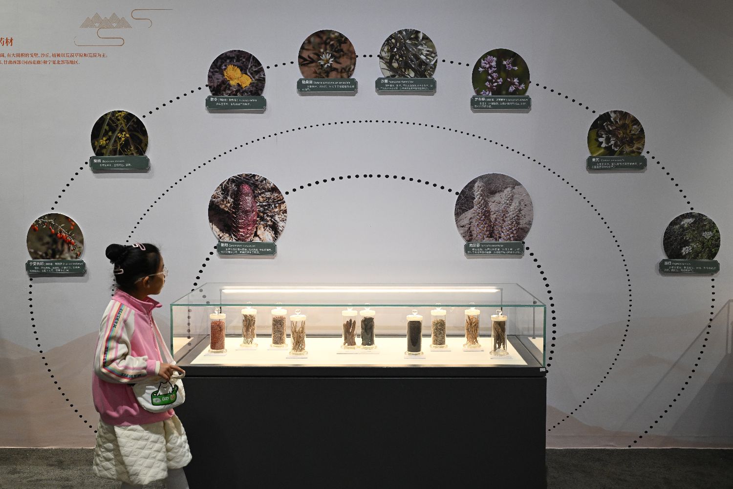 3月31日,北京,参观者在观看展览。日前,“本草 健康”展览亮相国家自然博物馆。展览共分为四个单元,从中医药学的历史渊源、文化内涵到发展应用,通过210件标本展品,深度诠释了中医药学的博大精深。(图片来源:中新社)