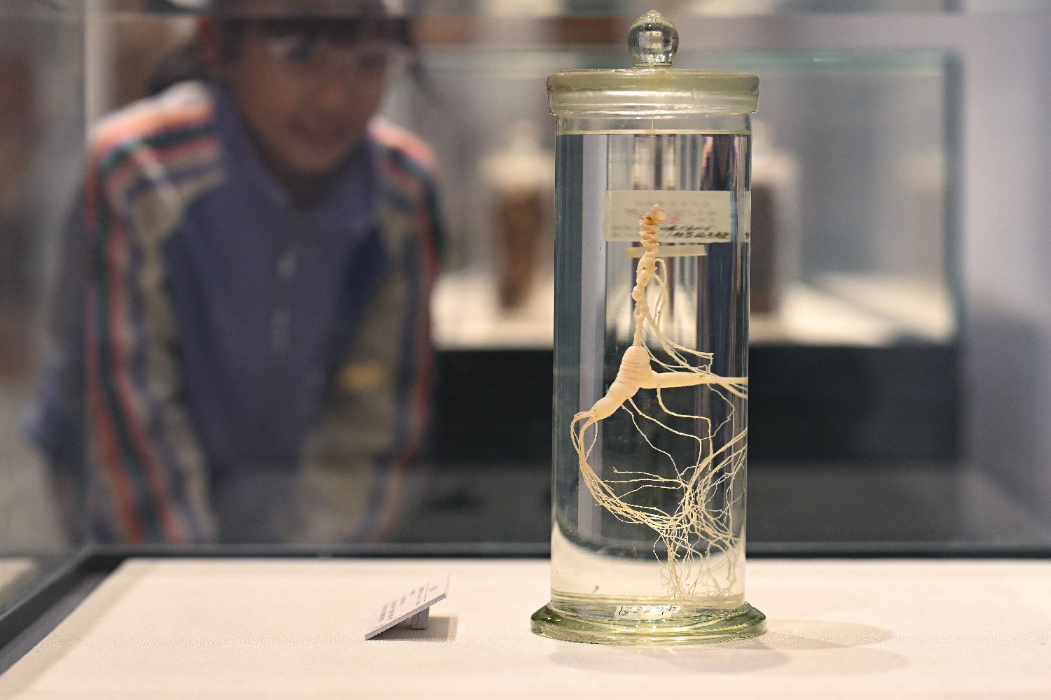 3月31日,北京,参观者在观看展出的人参。(图片来源:中新社)