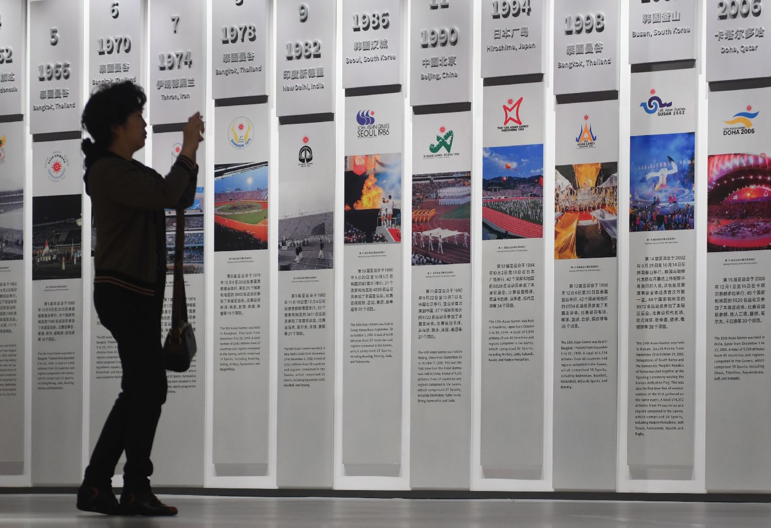 4月3日,参观者浏览拍摄历届亚运会的展板。(图片来源:中新社)