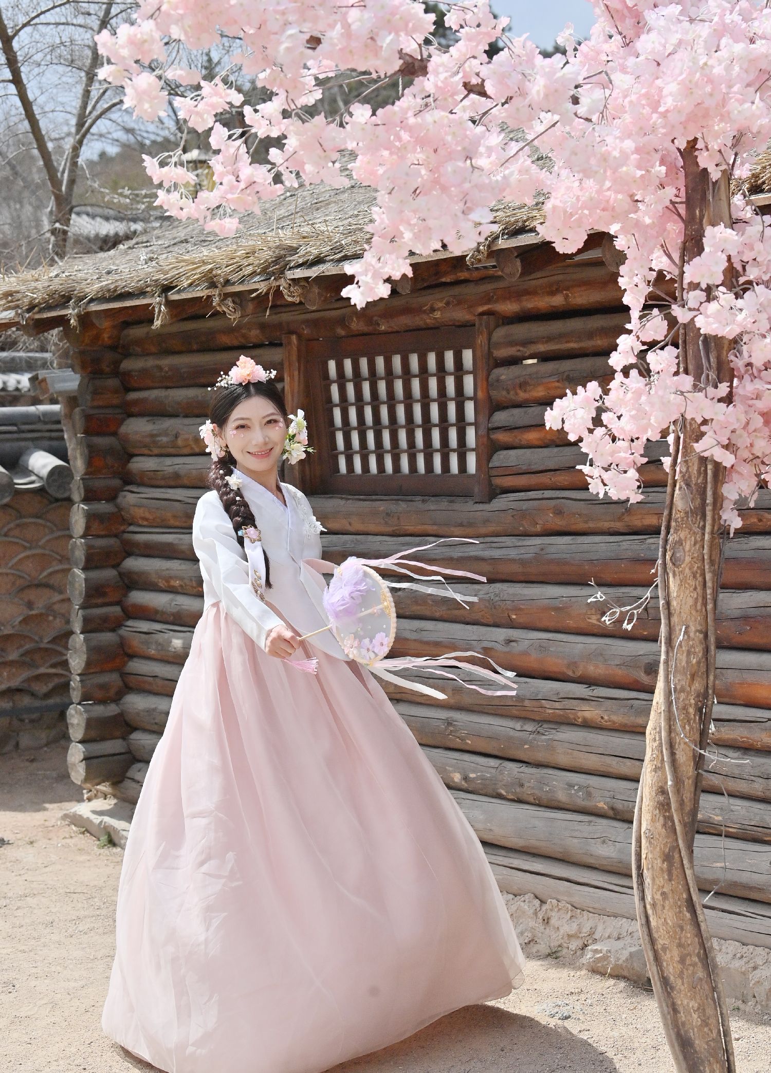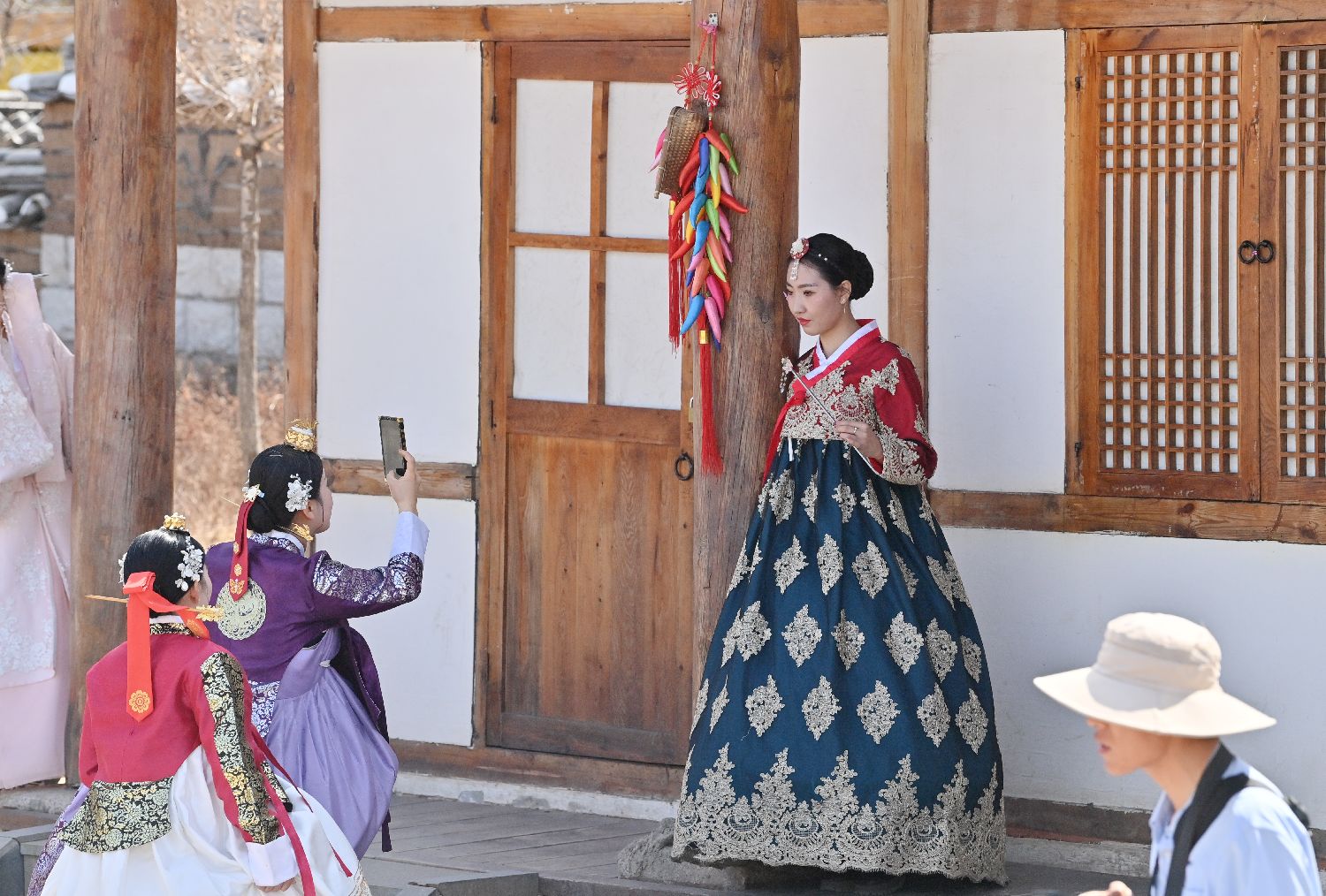 4月7日,在吉林省延边州延吉市的中国朝鲜族民俗园内,游客身着朝鲜族服饰拍照。延边是中国唯一的朝鲜族自治州和最大的朝鲜族聚居地,近年来延边旅游持续火爆,朝鲜族服饰旅拍也成为最受欢迎的旅游项目之一。(图片来源:中新社)