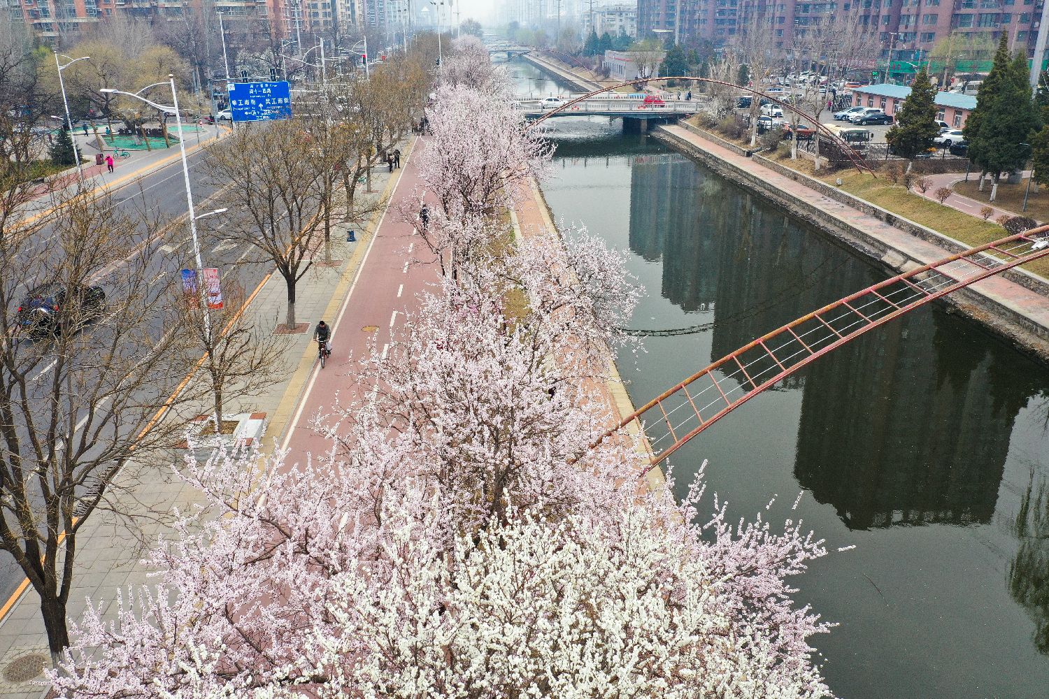 4月10日,随着气温转暖,在辽宁沈阳市铁西区卫工街全长近十里的河畔,桃花竞相开放。(无人机图片)(图片来源:中新社)