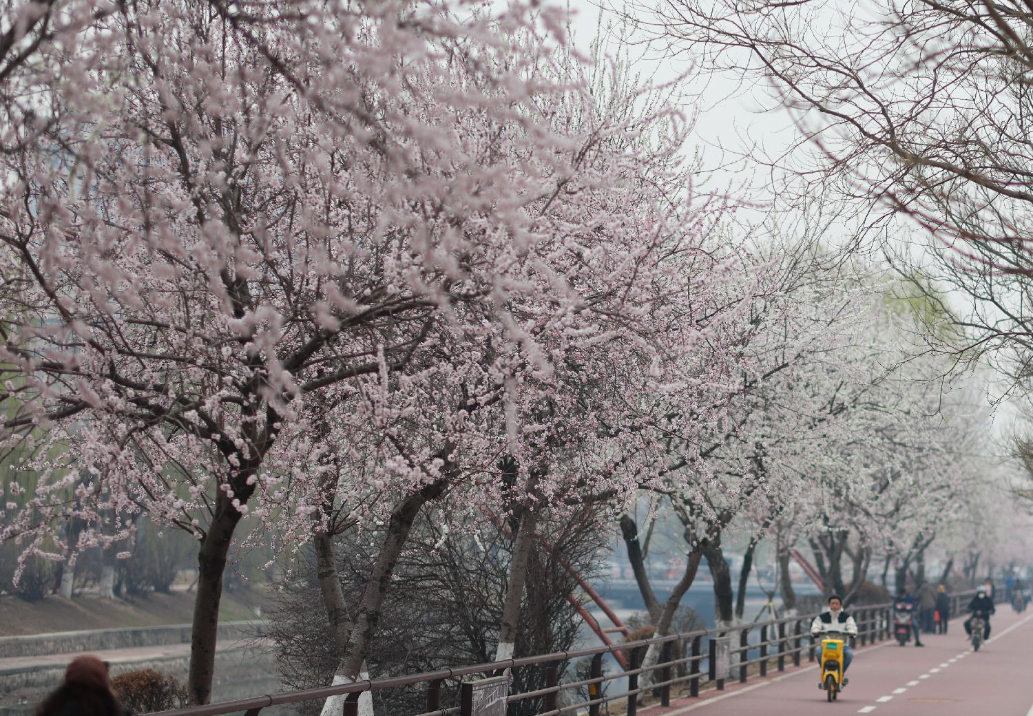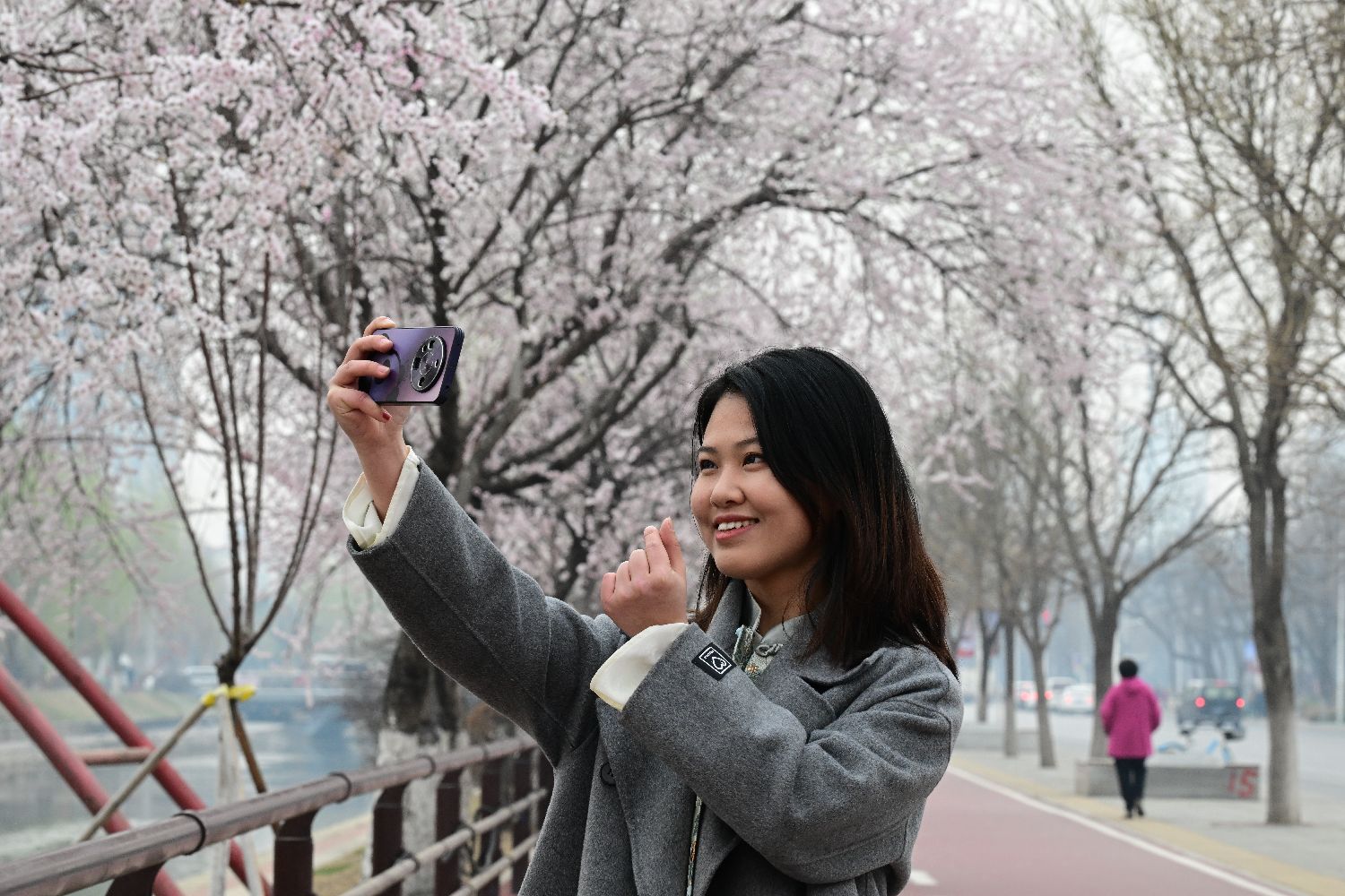 4月10日,随着气温转暖,在辽宁沈阳市铁西区卫工街全长近十里的河畔,桃花竞相开放,市民拍照留念。(图片来源:中新社)