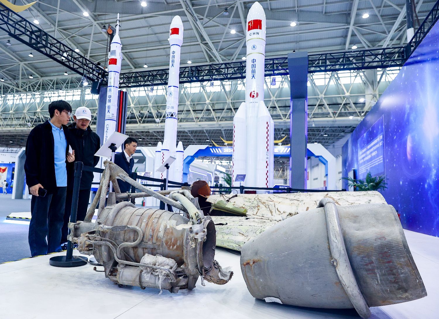 4月23日,2024年“中国航天日”航天科普系列展览在湖北武汉举行媒体开放日活动。展览自4月24日向公众开放。图为在科普展区展示的“长征三号乙”运载火箭发动机和整流罩残骸实物。(图片来源:中新社)