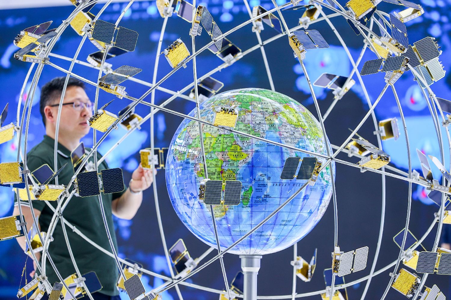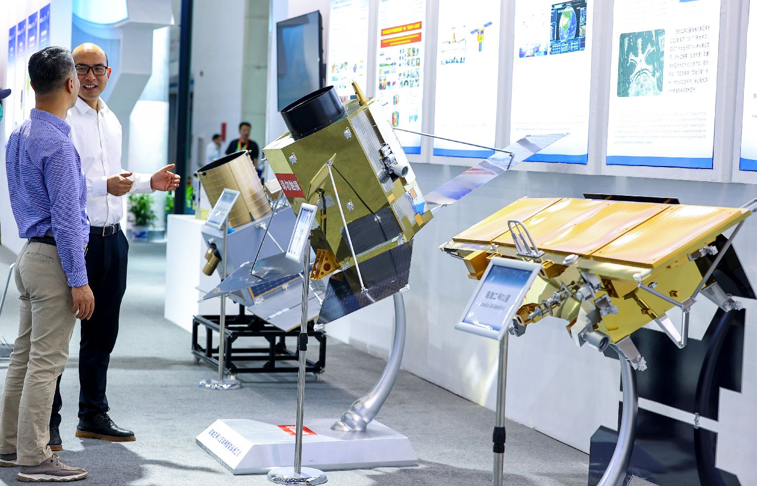 图为航天产业成就展区展示的天目一号星座低轨气象卫星系统模型。(图片来源:中新社)