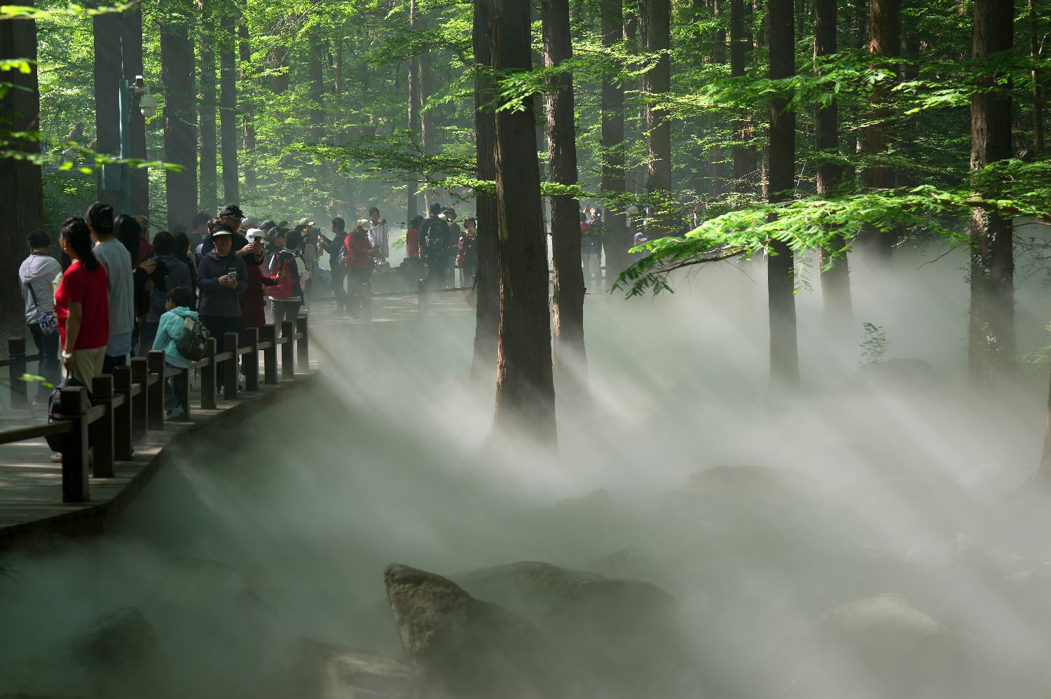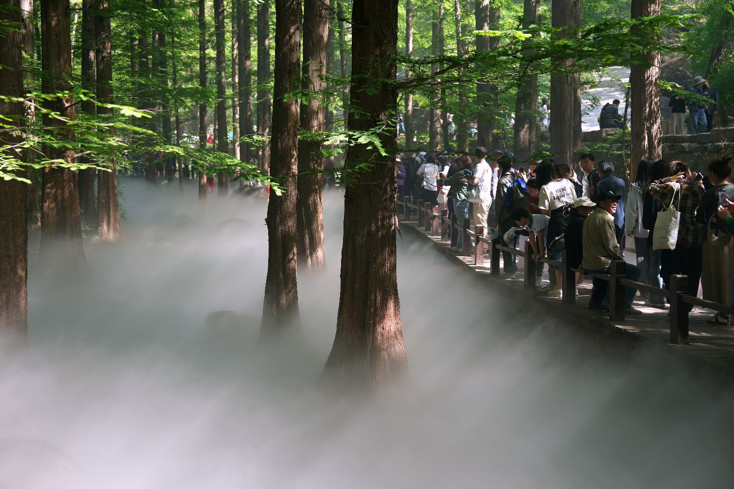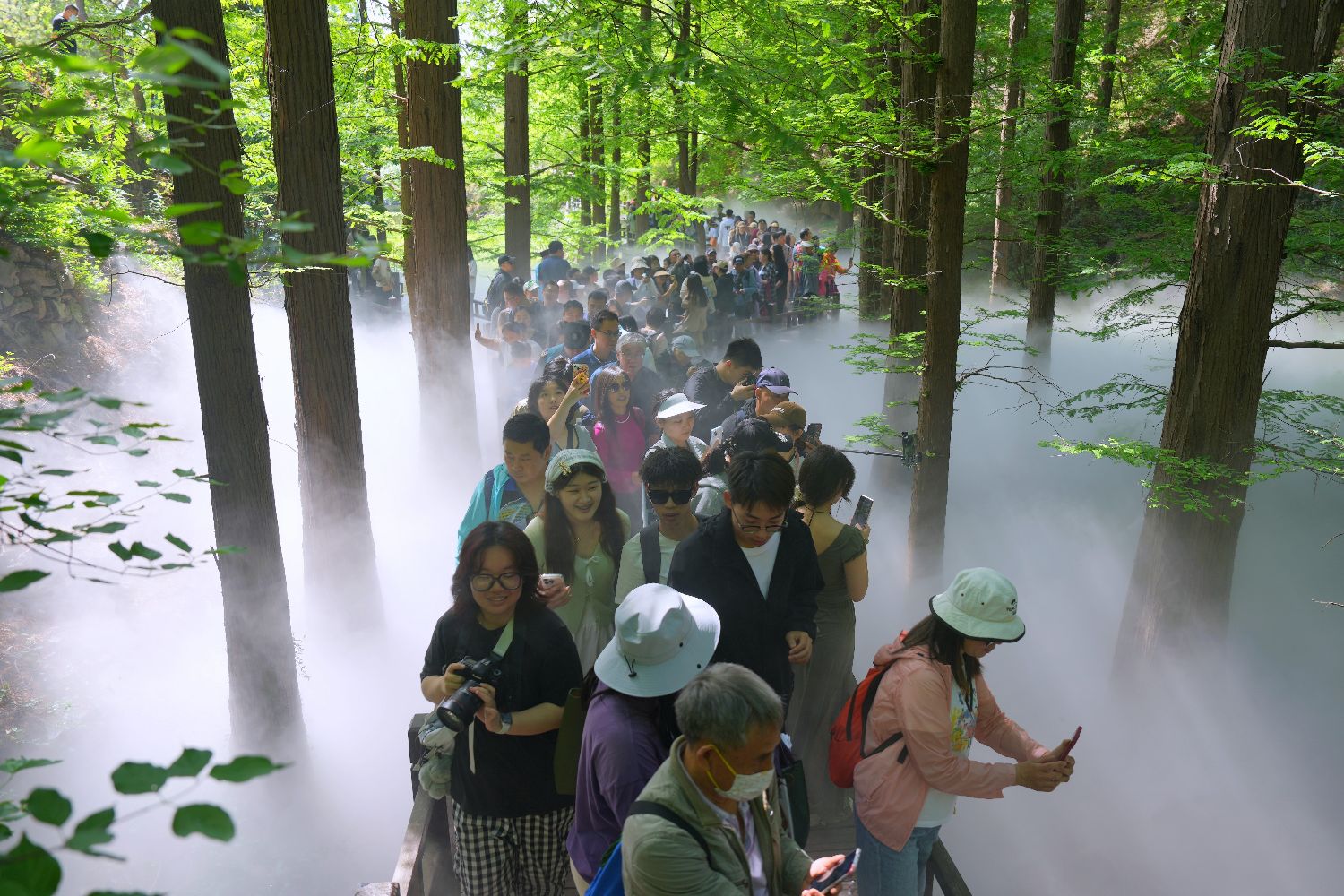 5月1日,位于北京西郊的国家植物园樱桃沟水杉林景区水雾缭绕,宛如“人间仙境”,吸引众多游客前来观赏。为吸引游客,国家植物园水杉林景区五一假期每天上午9点至10点进行喷雾。中新社
