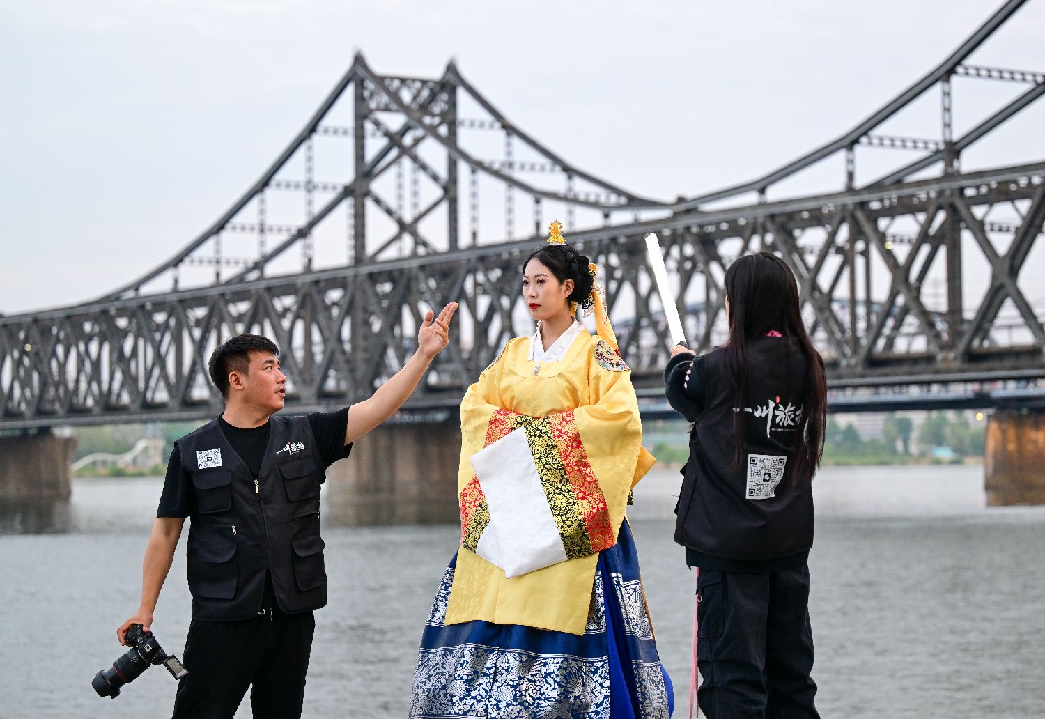 5月4日,华玉强(左)在鸭绿江边引导游客拍摄照片。(图片来源:中新社)