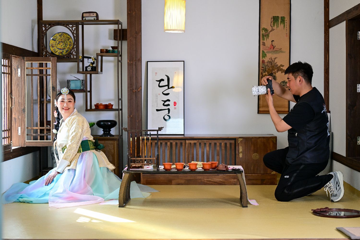 5月4日,华玉强(左)与游客交流。在辽宁省丹东市鸭绿江畔,“90后”的创业者兼摄影爱好者华玉强在2024年3月30日开设了一家特色朝鲜族民族服饰旅拍店“一川旅拍”。华玉强的旅拍店一开业就成了丹东社交媒体上的新晋“网红”店。旅拍店内陈列着各式各样的朝鲜族服饰,每一件都充满了浓厚的民族风情。游客们可以在这里挑选自己喜欢的服饰,穿上它们,在华玉强的镜头下,留下难忘的旅行回忆。(图片来源:中新社)