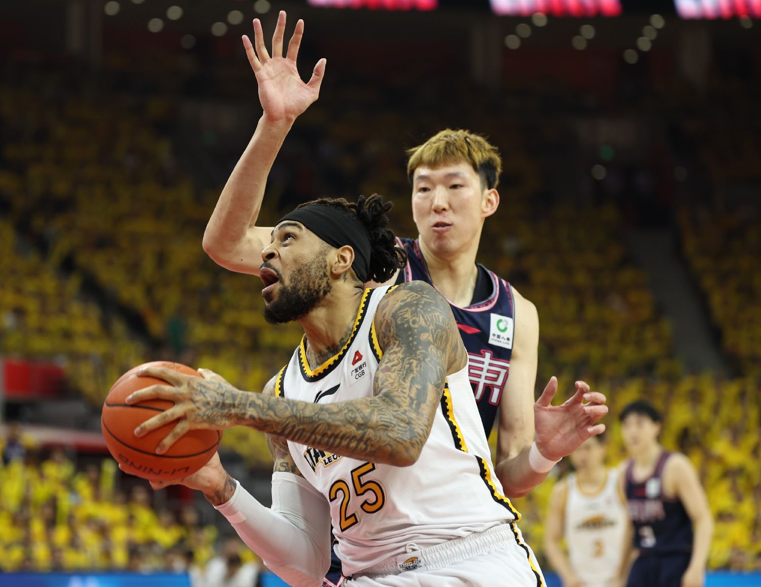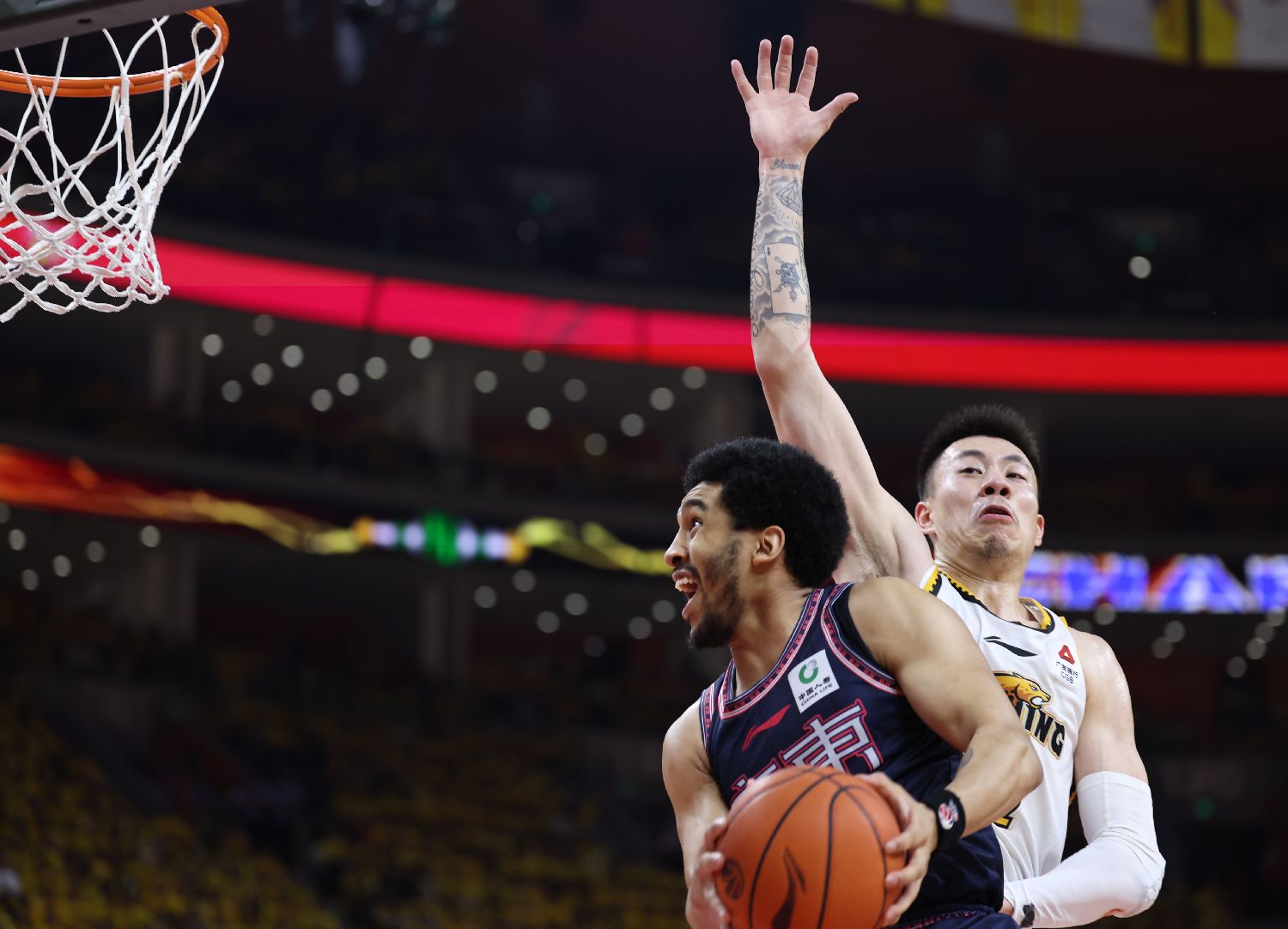 图为辽宁本钢队球员莫兰德(白)在比赛中进攻。(图片来源:中新社)