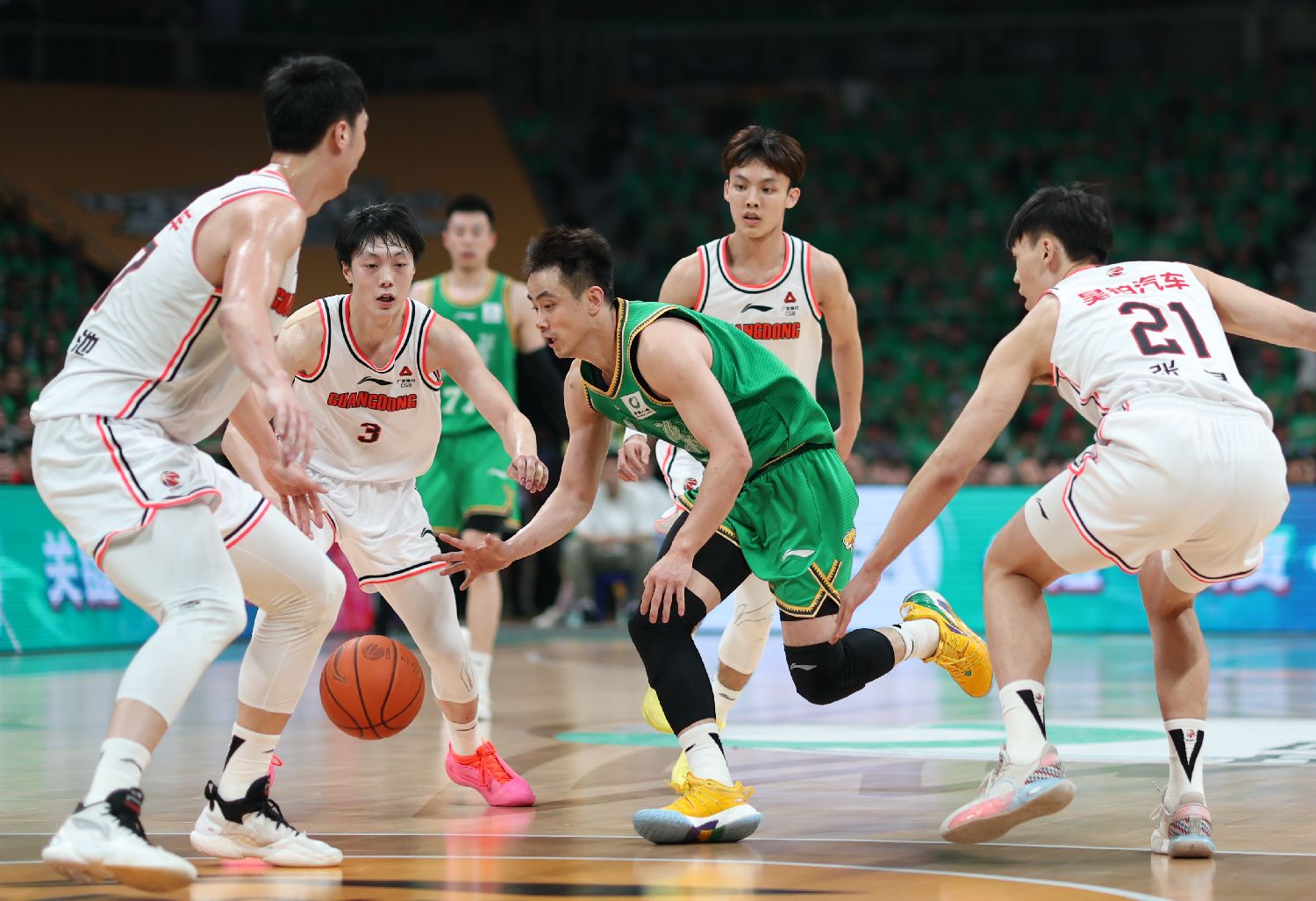 5月11日,在辽宁沈阳进行的2023-2024赛季中国男子篮球职业联赛(CBA)季后赛半决赛第5场比赛中,辽宁本钢队在主场116比95战胜广东华南虎队,以总比分3比2晋级总决赛。图为辽宁本钢队球员赵继伟(绿衣)在比赛中进攻。(图片来源:中新社)
