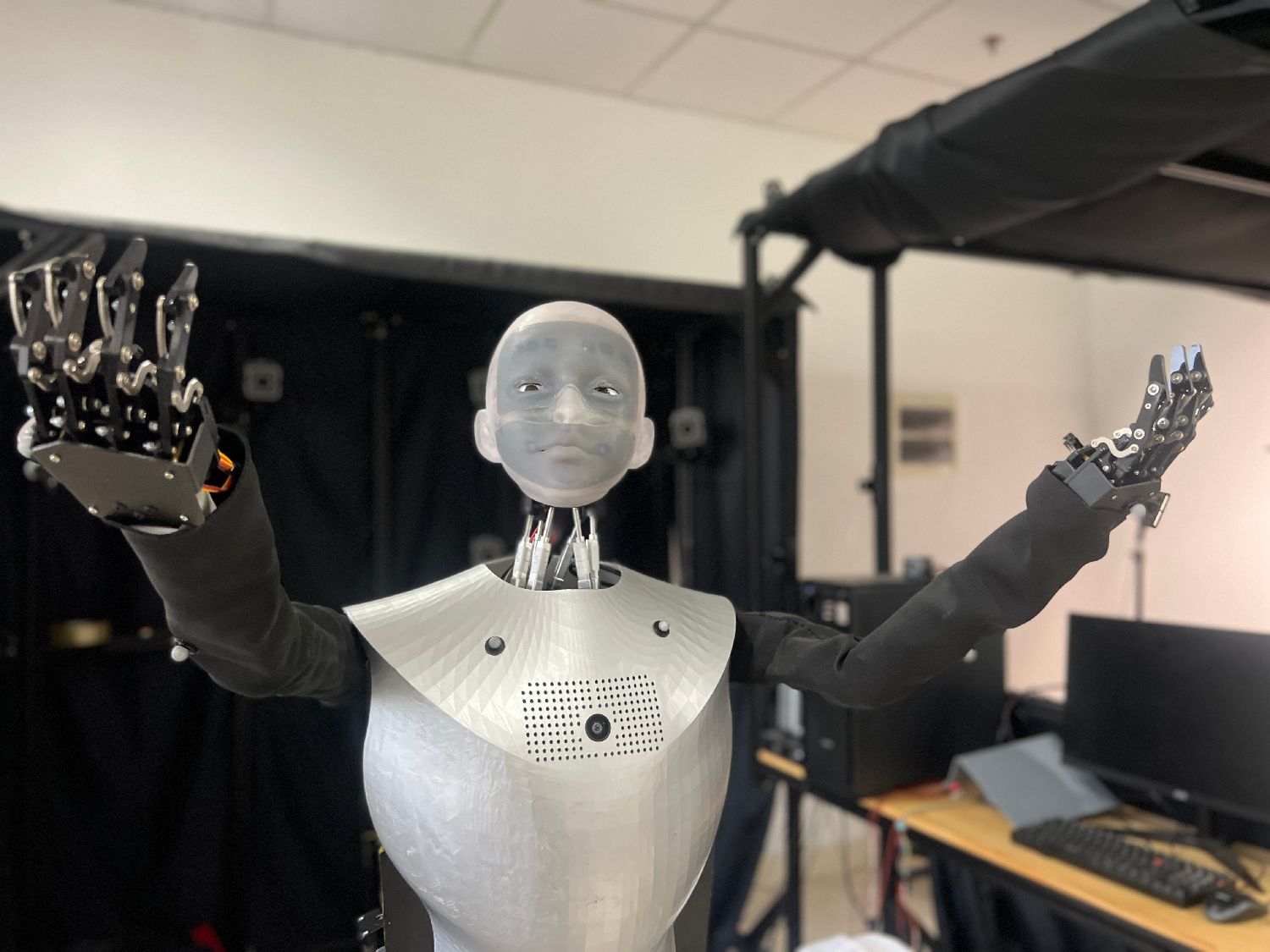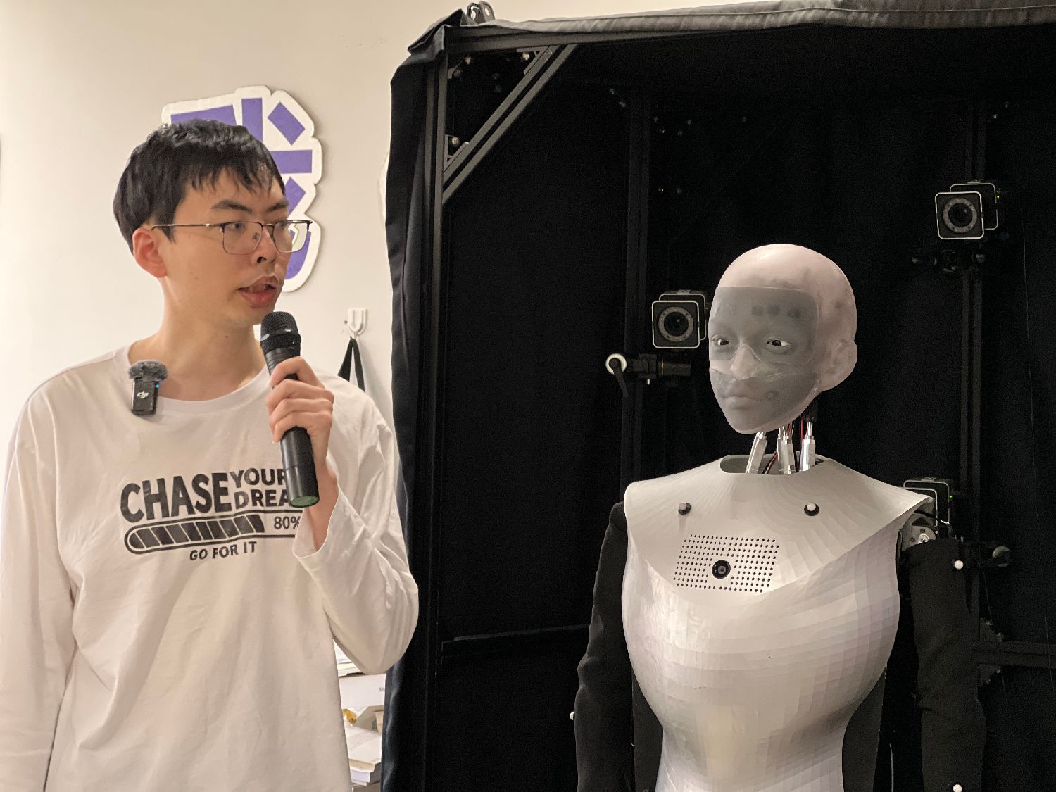 5月15日,在中国科学技术大学计算机科学与技术学院机器人实验室内,“90后”博士曹荣昀和他的团队正在展示自主研发的人形情感交互机器人。该款机器人的亮点在于其高度仿真的面部表情和触感,通过部署30个电机驱动器,实现了机器人面部肌肉的协同工作,让机器人能够呈现出真实自然的表情。(图片来源:中新社)
