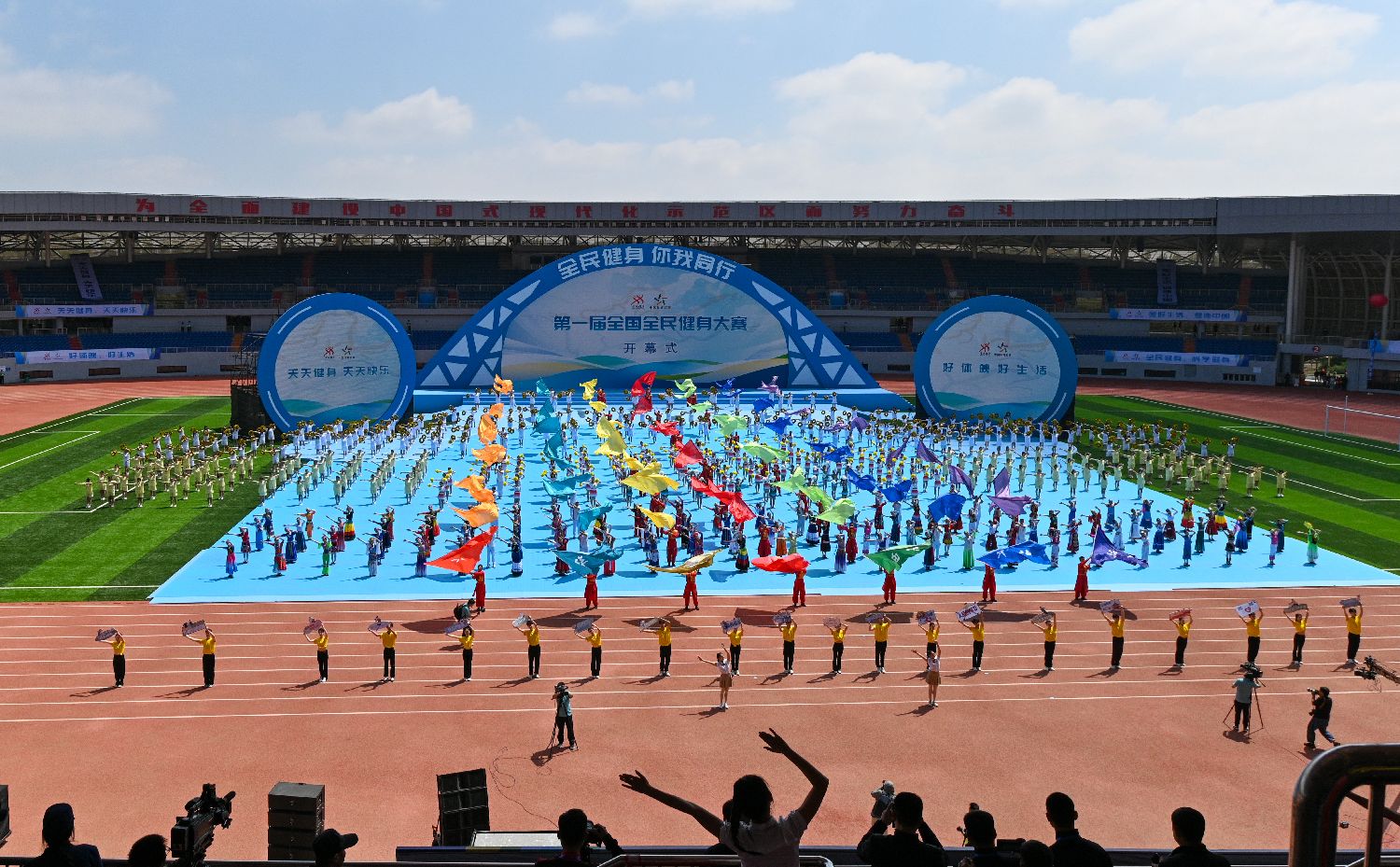 开幕式5月20日,第一届全国全民健身大赛在辽宁省沈阳市沈河区文化体育中心开幕。开幕式全民健身展演分为四个篇章。图为开幕式。(图片来源:中新社)