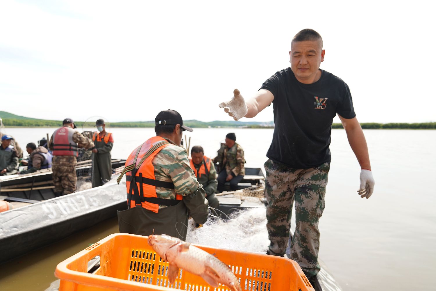 6月3日,黑龙江抚远,渔民在江上捕鱼。(图片来源:中新社)
