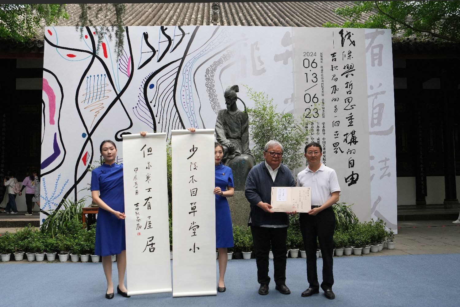 6月13日,由成都杜甫草堂博物馆、成都中国书法馆、中华诗歌研究院主办,中国诗书画研究会协办的“线条与哲思重构的自由:吉狄马加的另一个世界”展览在成都杜甫草堂博物馆开展。此次展览展出吉狄马加近年来创作的巨幅书法2件、对联36副、绘画作品43件,共展出81件作品,呈现了吉狄马加诗歌、书法、绘画的代表作品和艺术精华。该展作为吉狄马加涵盖诗歌、书法、绘画的综合艺术展,向观众整体展示了其作为诗人和艺术家的创作形态和艺术理念。吉狄马加,彝族诗人,现任中国少数民族作家学会名誉会长、中国作协诗歌委员会主任。(图片来源:中新社)