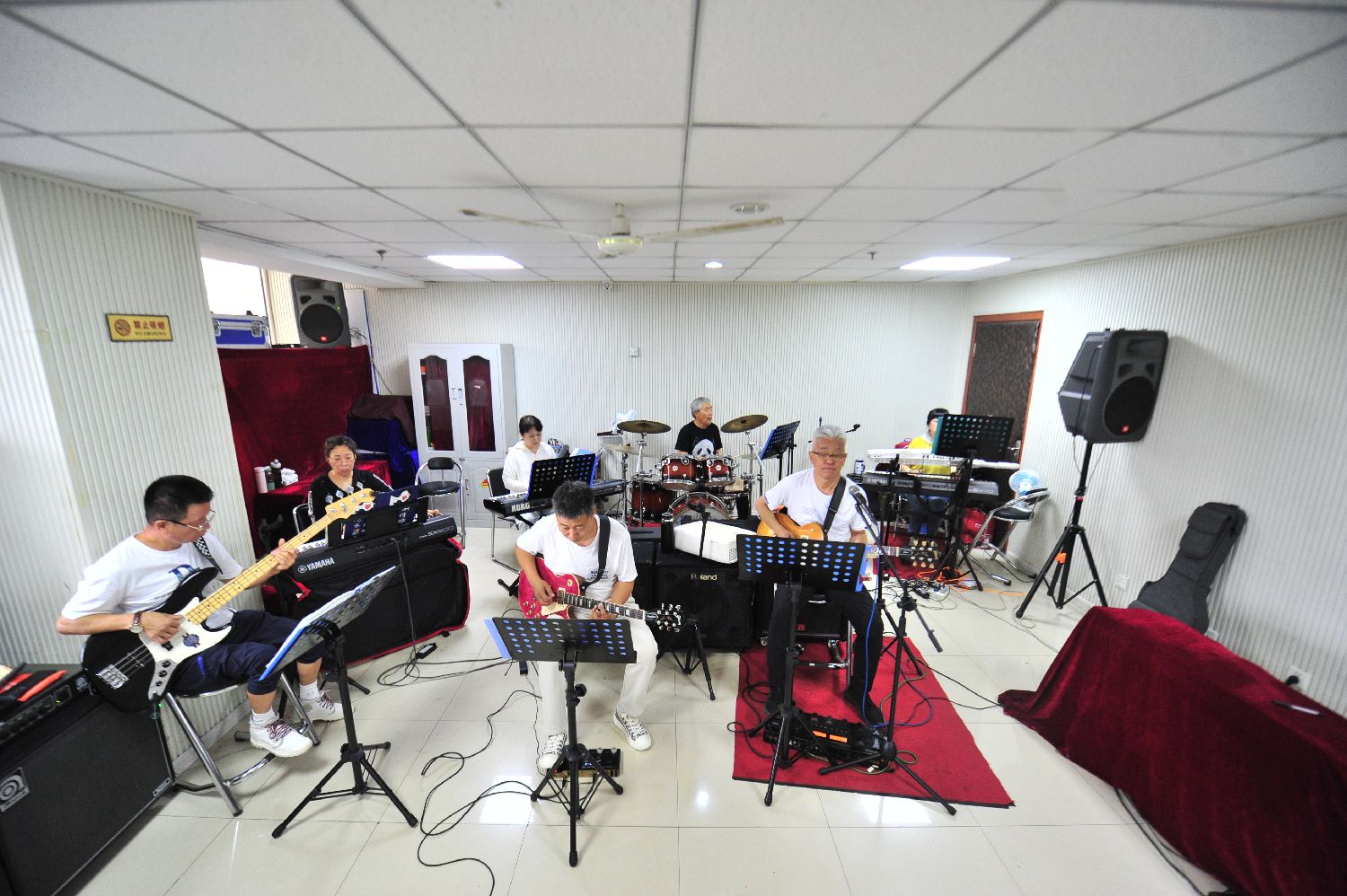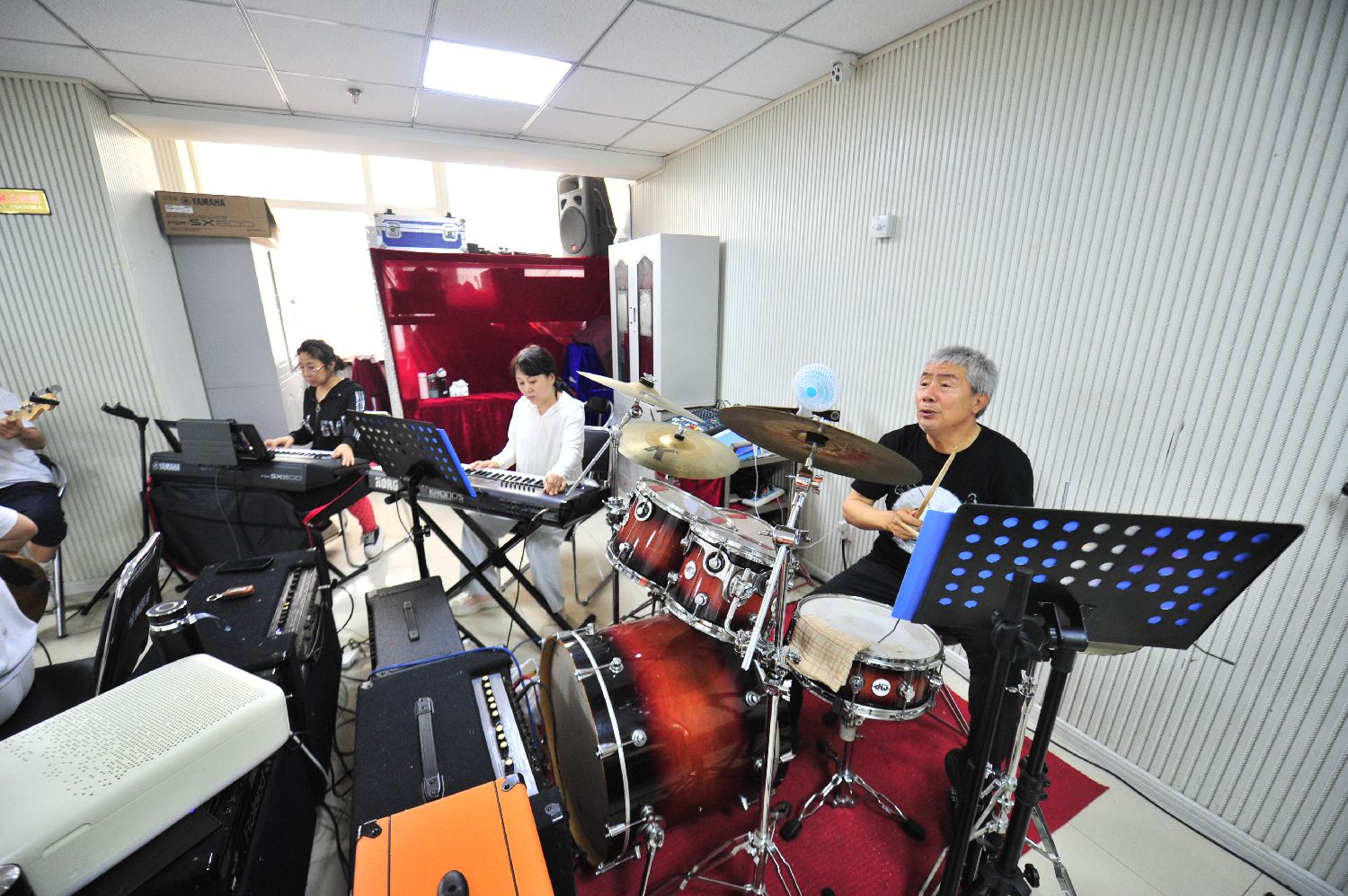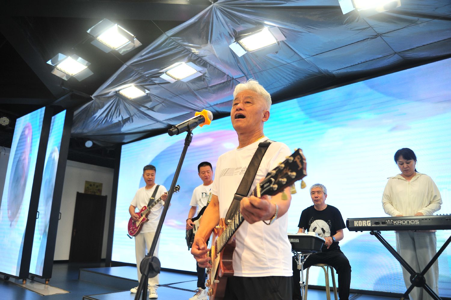 7月4日,吉林长春,火焰老年乐队在演奏摇滚乐。(图片来源:中新社)