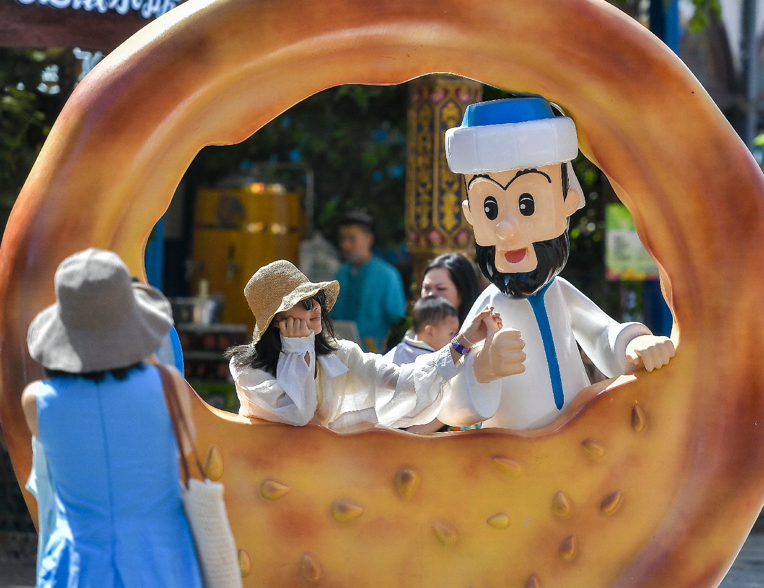 7月8日,新疆乌鲁木齐市大巴扎步行街,阿凡提主题雕像吸引游客拍照留念。暑期来临,乌鲁木齐市大巴扎景区迎来大量游客,各地游客在此欣赏新疆歌舞,品尝新疆美食,感受新疆魅力。(图片来源:中新社)