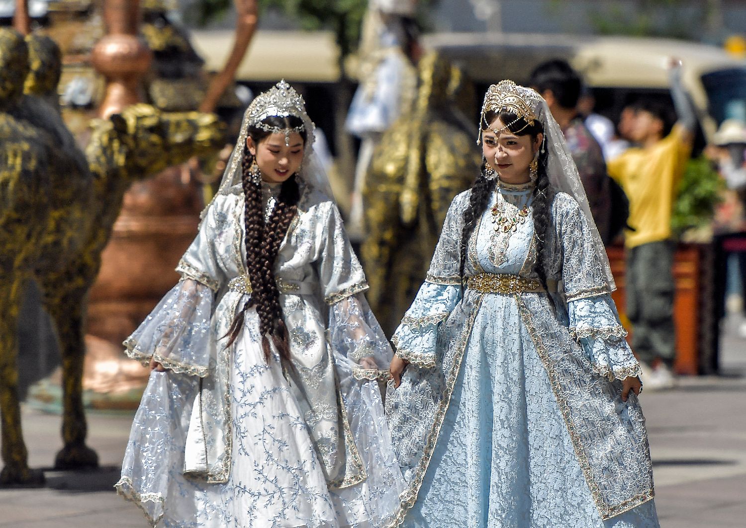 7月8日,新疆乌鲁木齐市大巴扎步行街,游客身穿民族服饰旅拍。(图片来源:中新社)