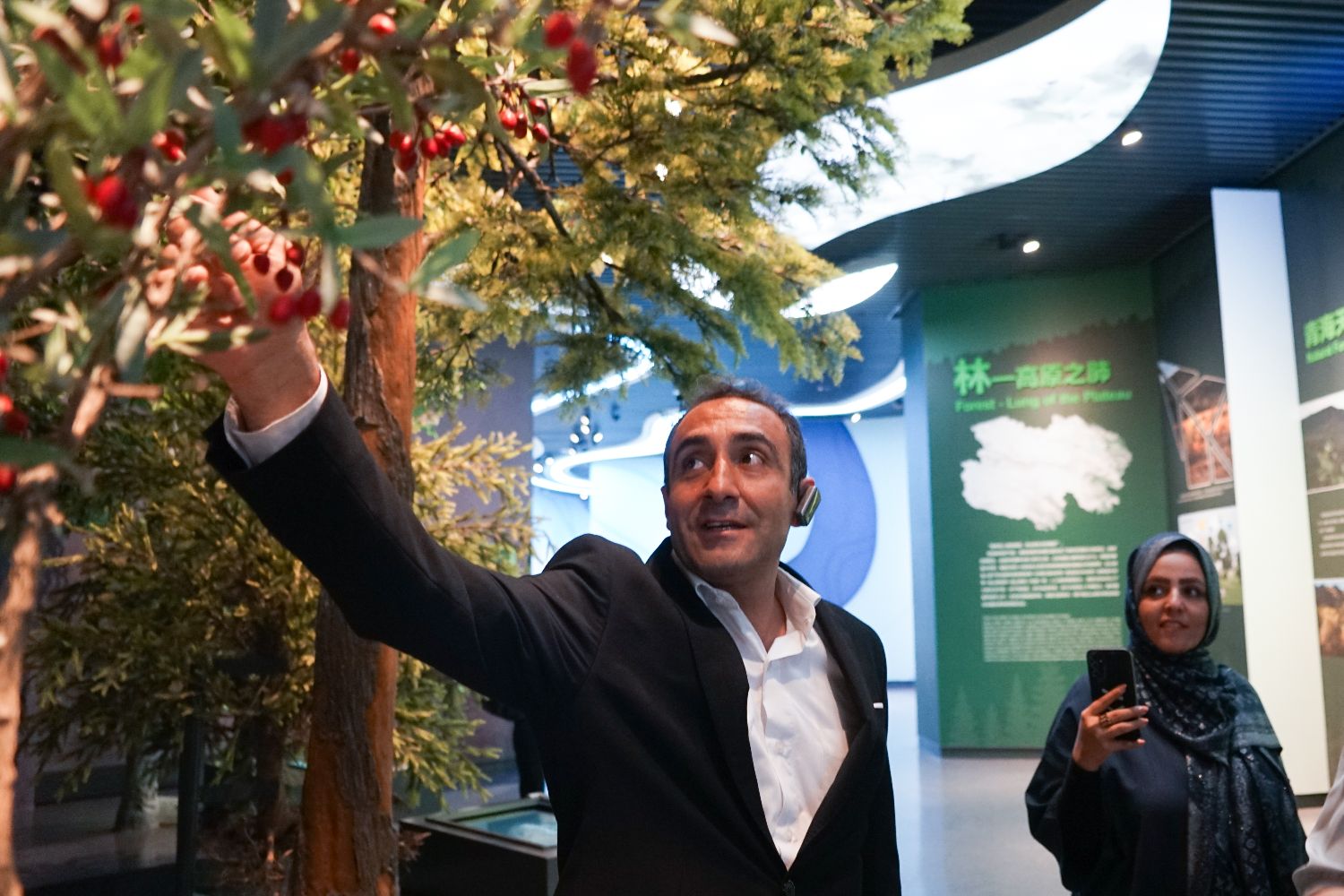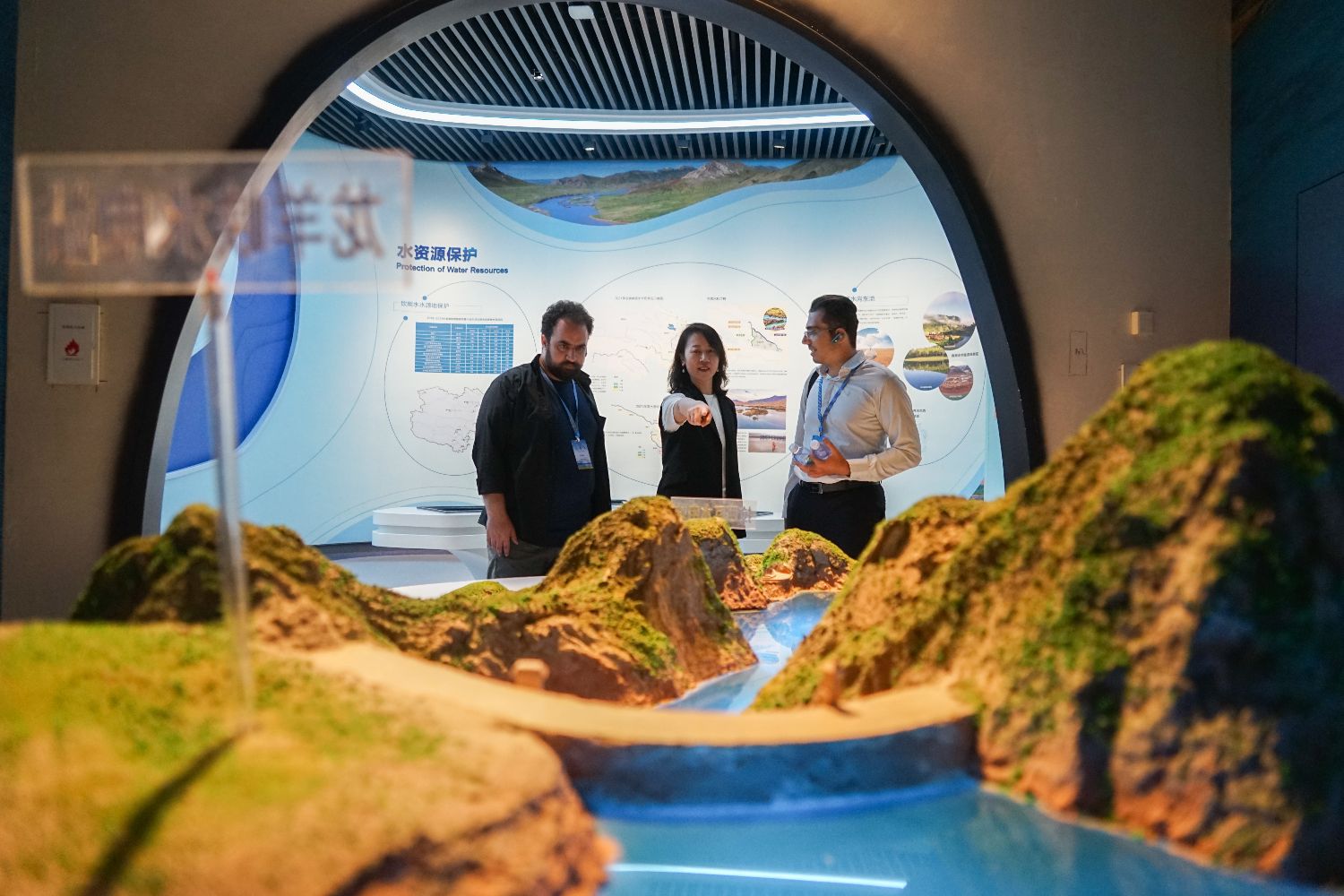 7月10日,伊朗记者听讲解员(中)介绍青海省水资源情况。当日,由伊朗声像组织、迈赫尔通讯社等7家伊朗媒体组成的记者团探访位于西宁市的青海省自然资源博物馆,了解当地生态文明建设成果及人与自然和谐共生的实践经验。(图片来源:中新社)