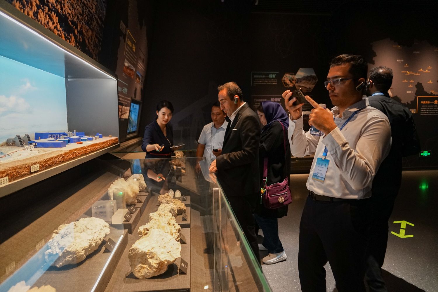 7月10日,伊朗记者团听讲解员(左一)介绍青海省矿物资源并拍摄视频。(图片来源:中新社)