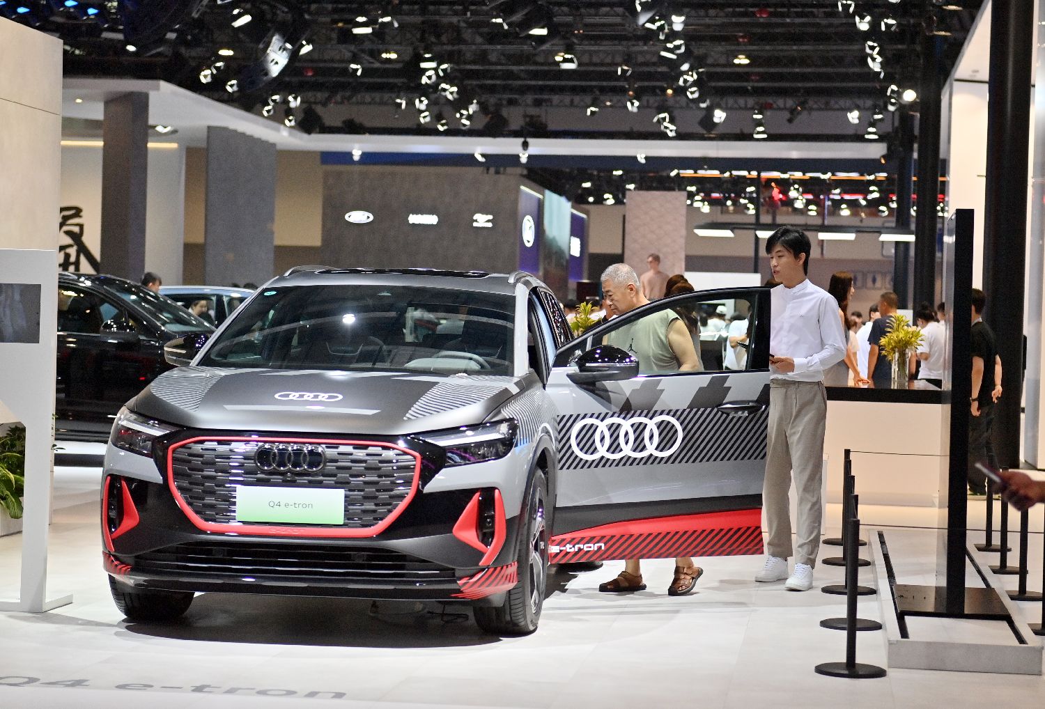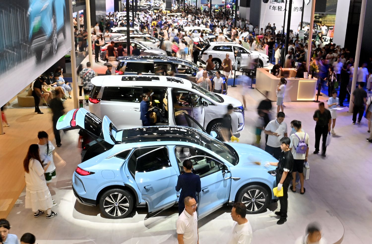 7月13日,观众在长春东北亚国际博览中心参观展车。当日,第21届长春国际汽车博览会开幕,全球124家车企携1100辆汽车参展,其中新能源展车超过300辆,数量创历届之最。(图片来源:中新社)