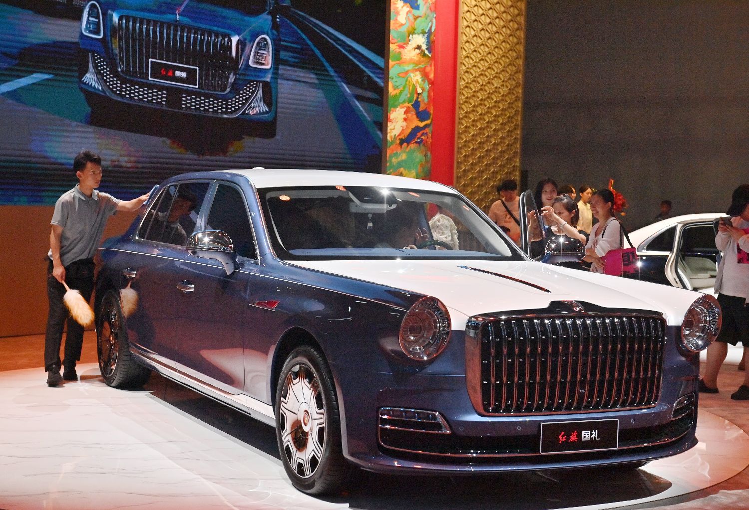 7月13日,吉林长春,市民在展台参观红旗国礼汽车。当天,第21届长春国际汽车博览会开幕,中国自主品牌红旗汽车多款车型亮相,吸引众多参观者。(图片来源:中新社)