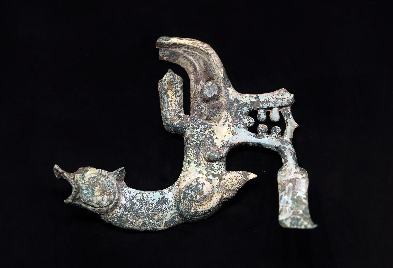 7月23日,“匠心妙手——三星堆遗址新出土文物保护修复成果展示”在四川广汉三星堆博物馆开展。此次展览展出包括青铜瓿、金面具、青铜扭头跪坐人像、圆口方尊、青铜神树枝等在内的50余件青铜器、金器、玉器、象牙等代表性器物,近九成文物为首次亮相。图为7月22日拍摄的“匠心妙手——三星堆遗址新出土文物保护修复成果展示”展出的青铜龙首。(图片来源:中新社)