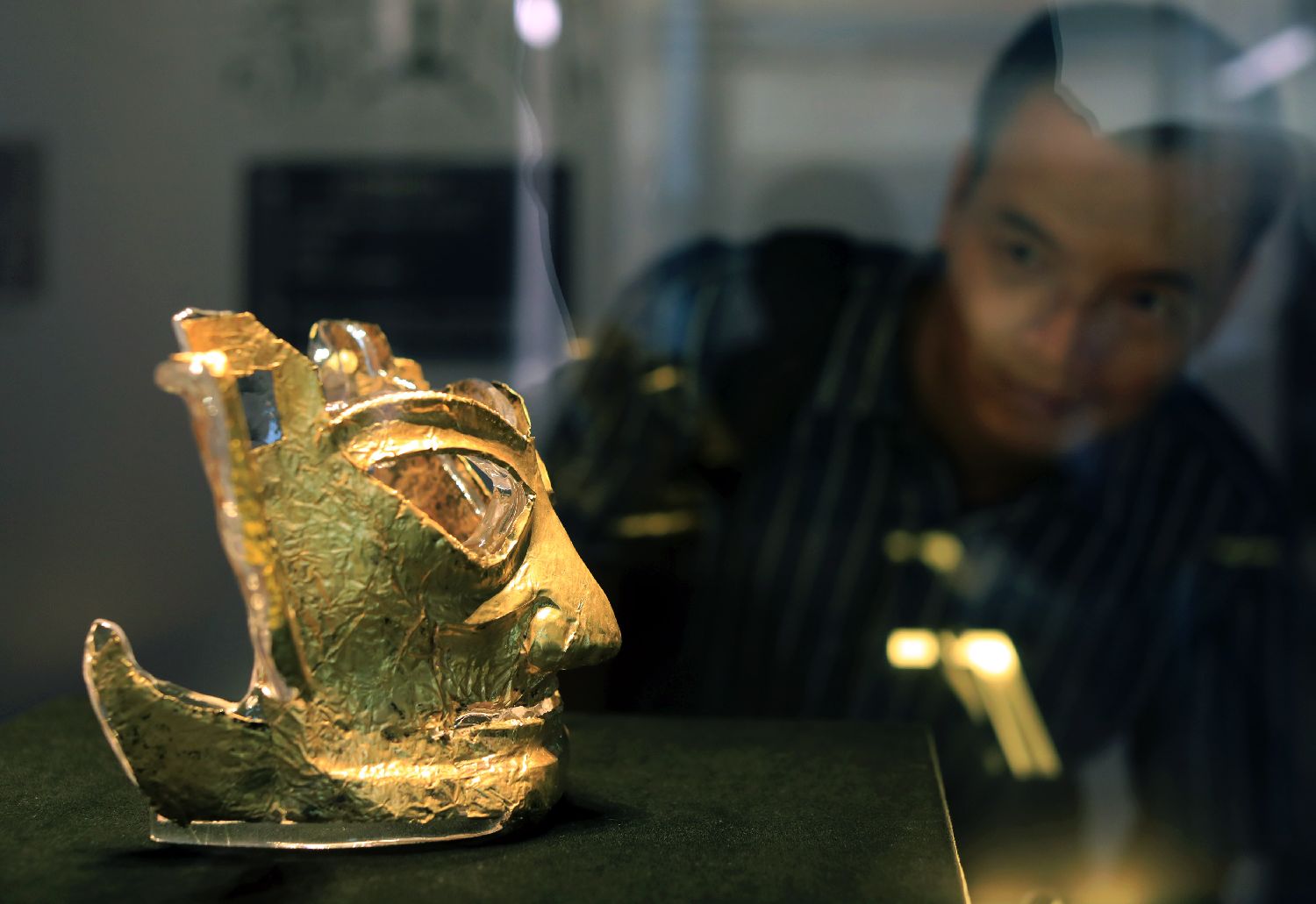 图为7月22日,参观者在“匠心妙手——三星堆遗址新出土文物保护修复成果展示”试开放期观看展出的金面具。(图片来源:中新社)
