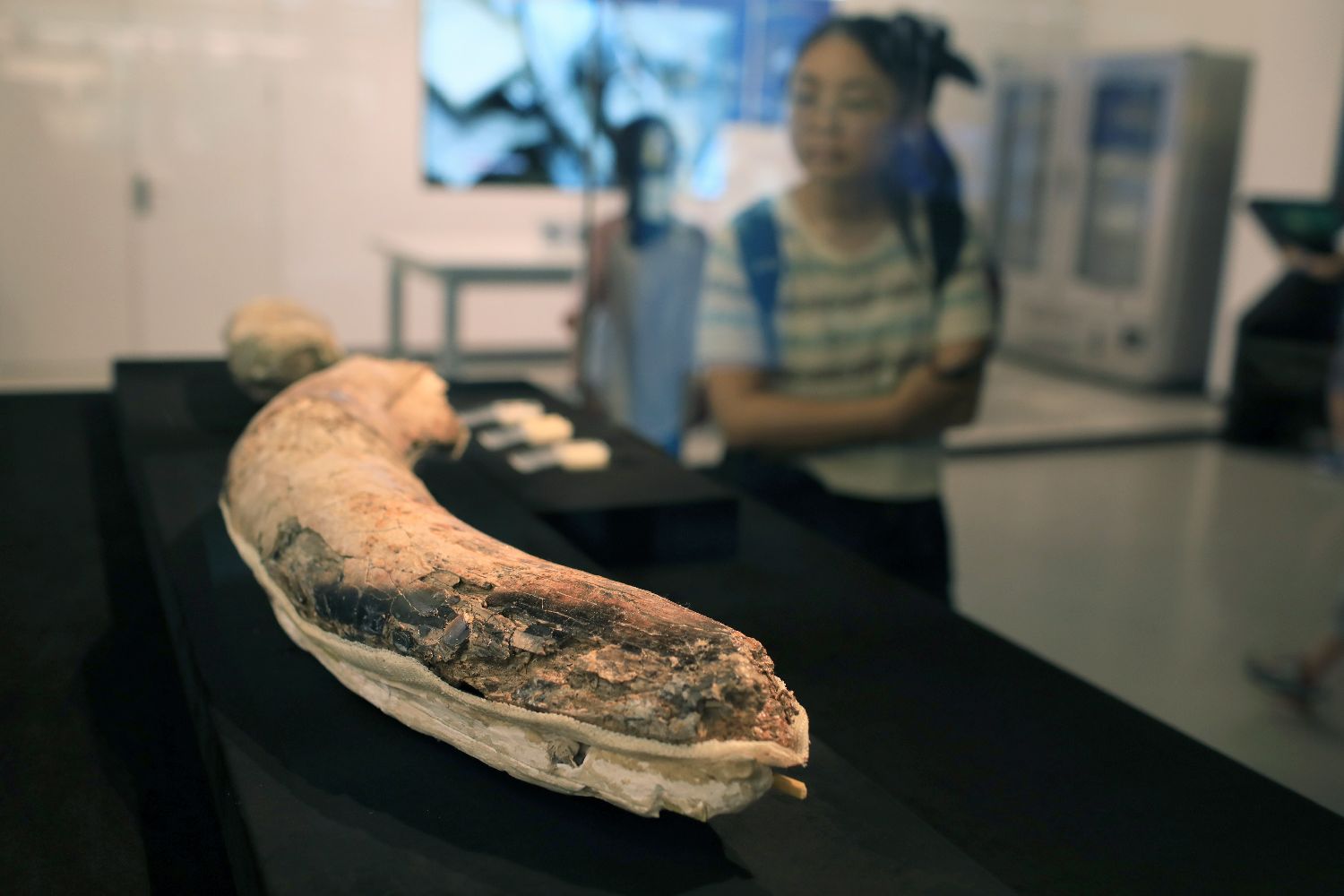 图为7月22日,参观者在“匠心妙手——三星堆遗址新出土文物保护修复成果展示”试开放期观看展出的象牙。(图片来源:中新社)