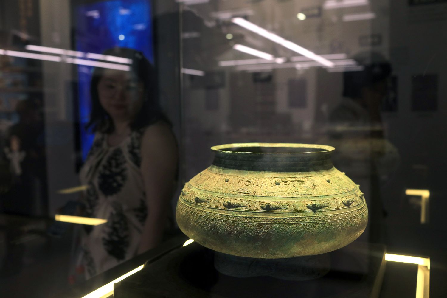 图为7月22日,参观者在“匠心妙手——三星堆遗址新出土文物保护修复成果展示”试开放期观看展出的青铜瓿。(图片来源:中新社)