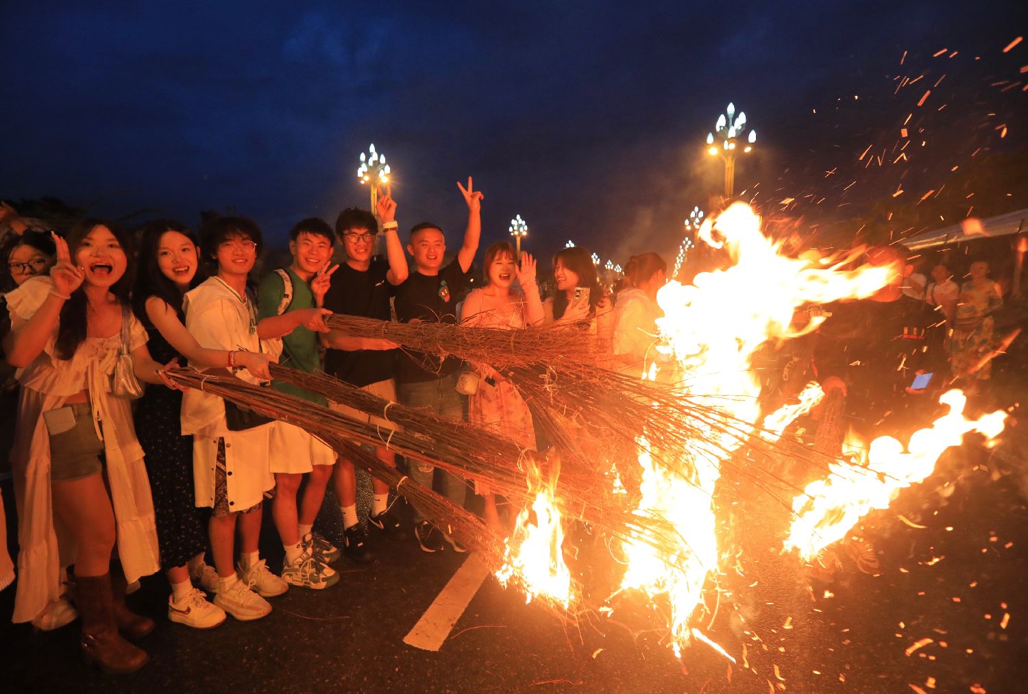 7月29日晚,“激情火把节最炫民族风”2024年凉山彝族火把节的“重头戏”火把狂欢夜在四川省西昌市举行,当地民众和游客点燃手中的火把,载歌载舞欢庆彝族最重要的节日之一——火把节。(图片来源:中新社)