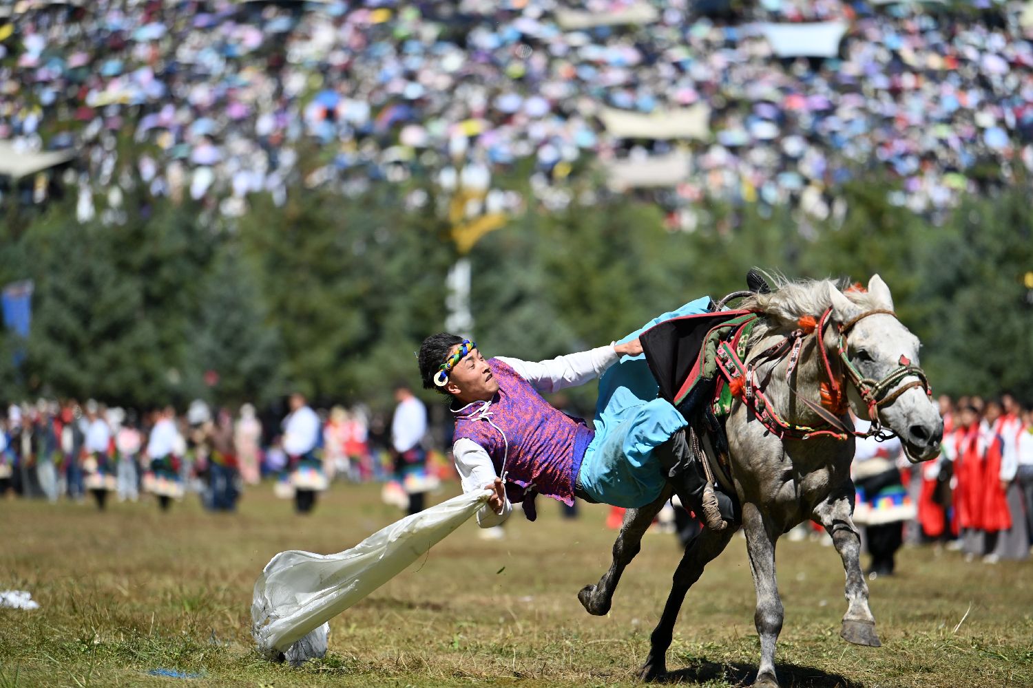 8月4日,藏族骑手在当周草原上表演马术。当日,第22届九色甘南香巴拉旅游艺术节在甘肃省甘南藏族自治州当周草原开幕。人们身着节日盛装载歌载舞、欢聚一堂,马队巡游、千人锅庄舞等活动精彩上演。(图片来源:中新社)