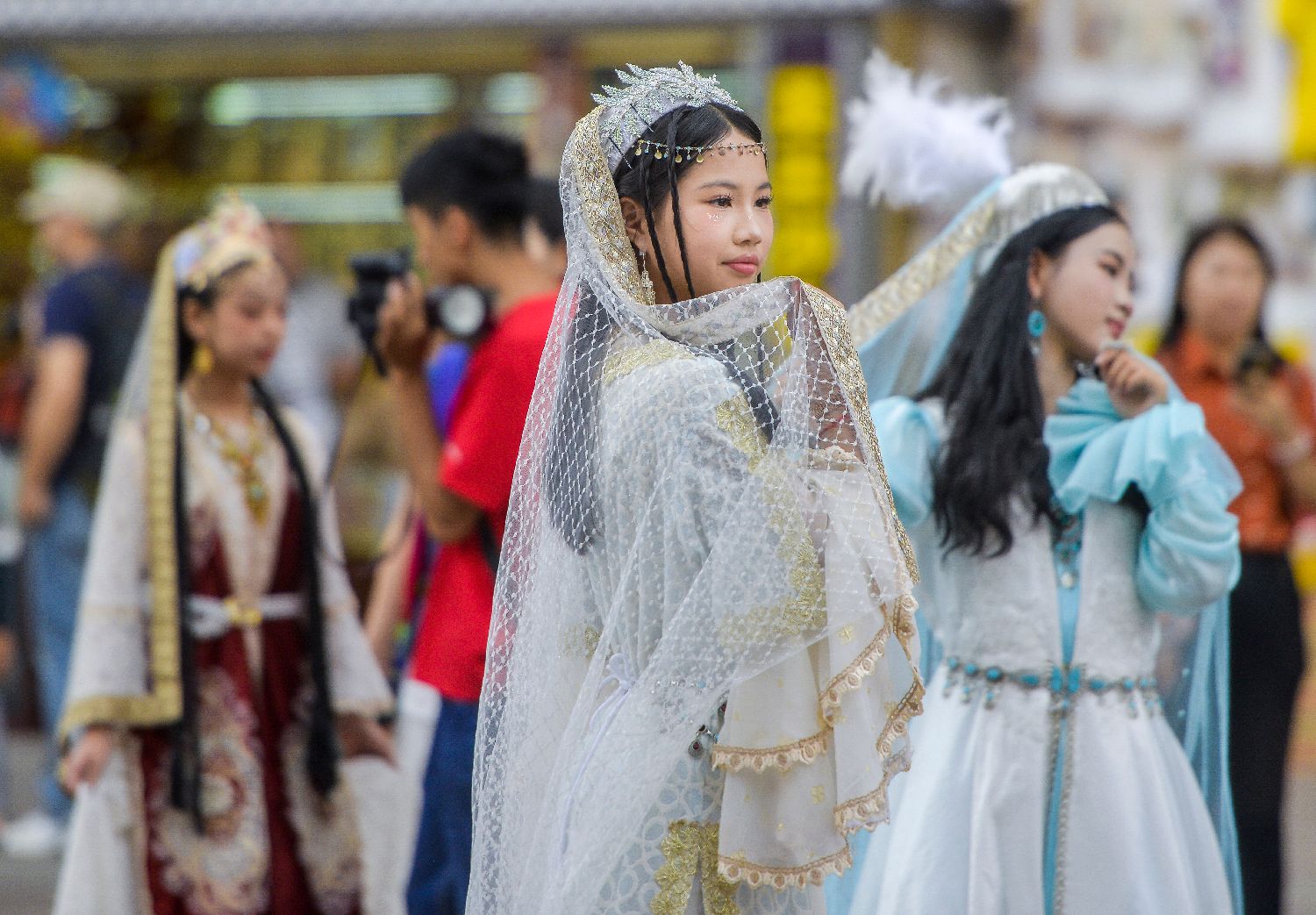 8月12日,新疆乌鲁木齐市大巴扎步行街,游客穿着经过改进的民族服饰拍摄写真照片。8月正值新疆旅游旺季,各种民族特色旅拍主题受到游客的追捧。(图片来源:中新社)
