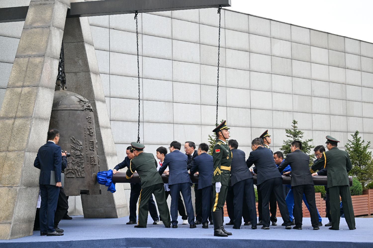 9月18日,勿忘九一八撞钟鸣警仪式在辽宁沈阳“九·一八”历史博物馆进行。各界人士代表共同撞响警世钟14下,代表中华民族14年浴血抗战的艰苦历程,警醒人们勿忘国耻、振兴中华。今年是九一八事变爆发93周年。图为各界代表共同撞响“警世钟”。(图片来源:中新社)