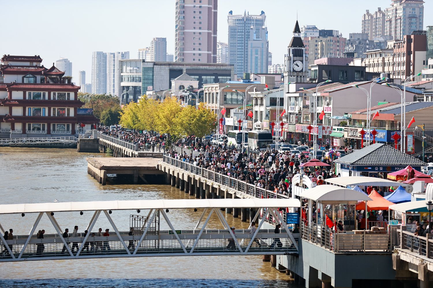 10月3日,众多游客游览中国边境城市辽宁丹东。国庆假期期间,游览鸭绿江、欣赏中朝两国风光,成为丹东边境旅游的一大亮点。图为游客在鸭绿江畔游览。(图片来源:中新社)